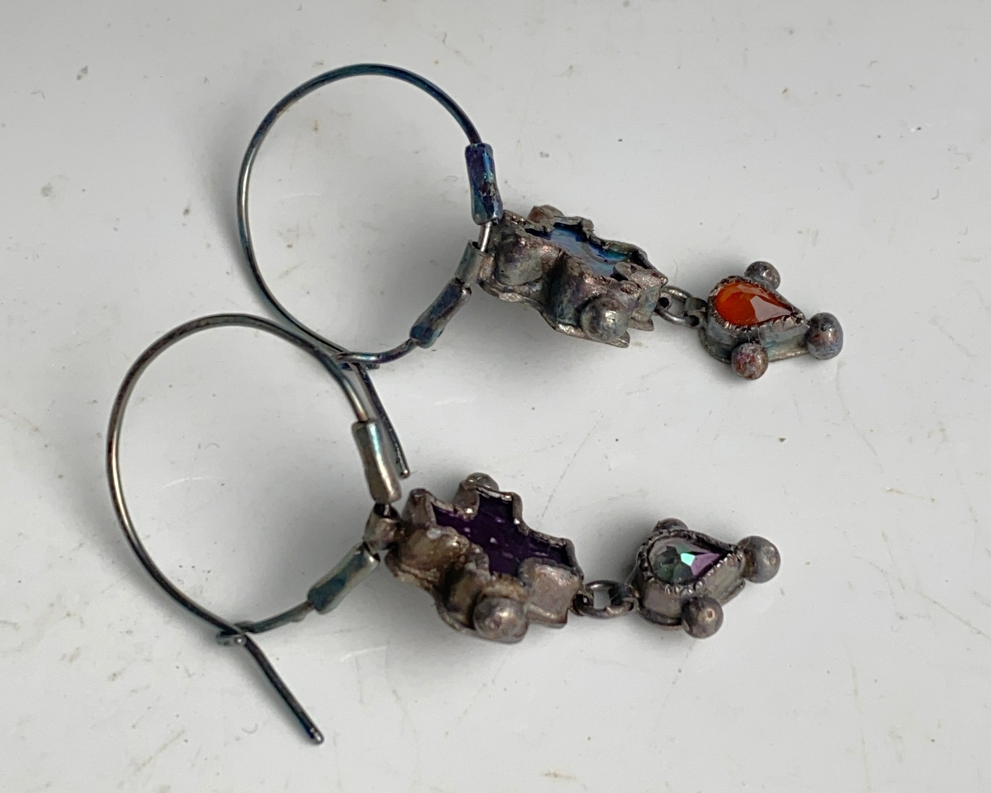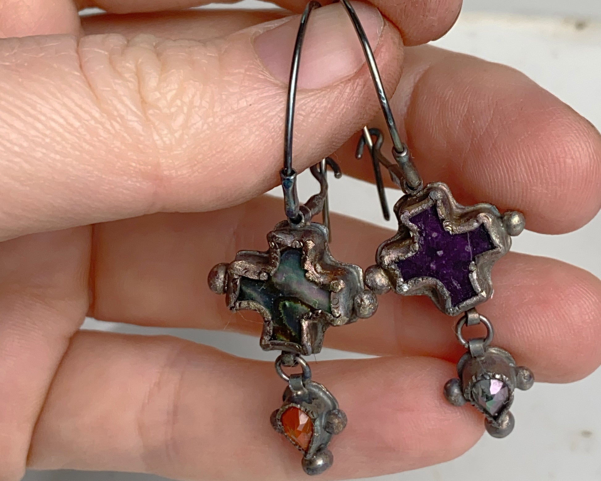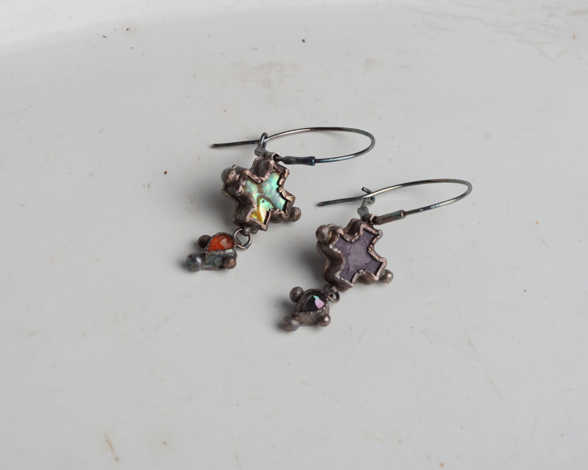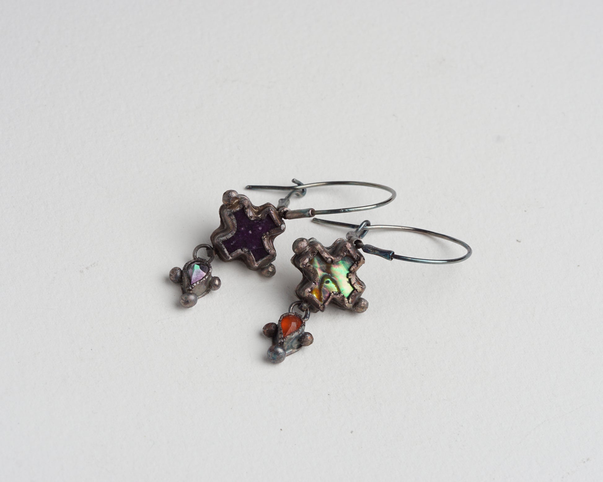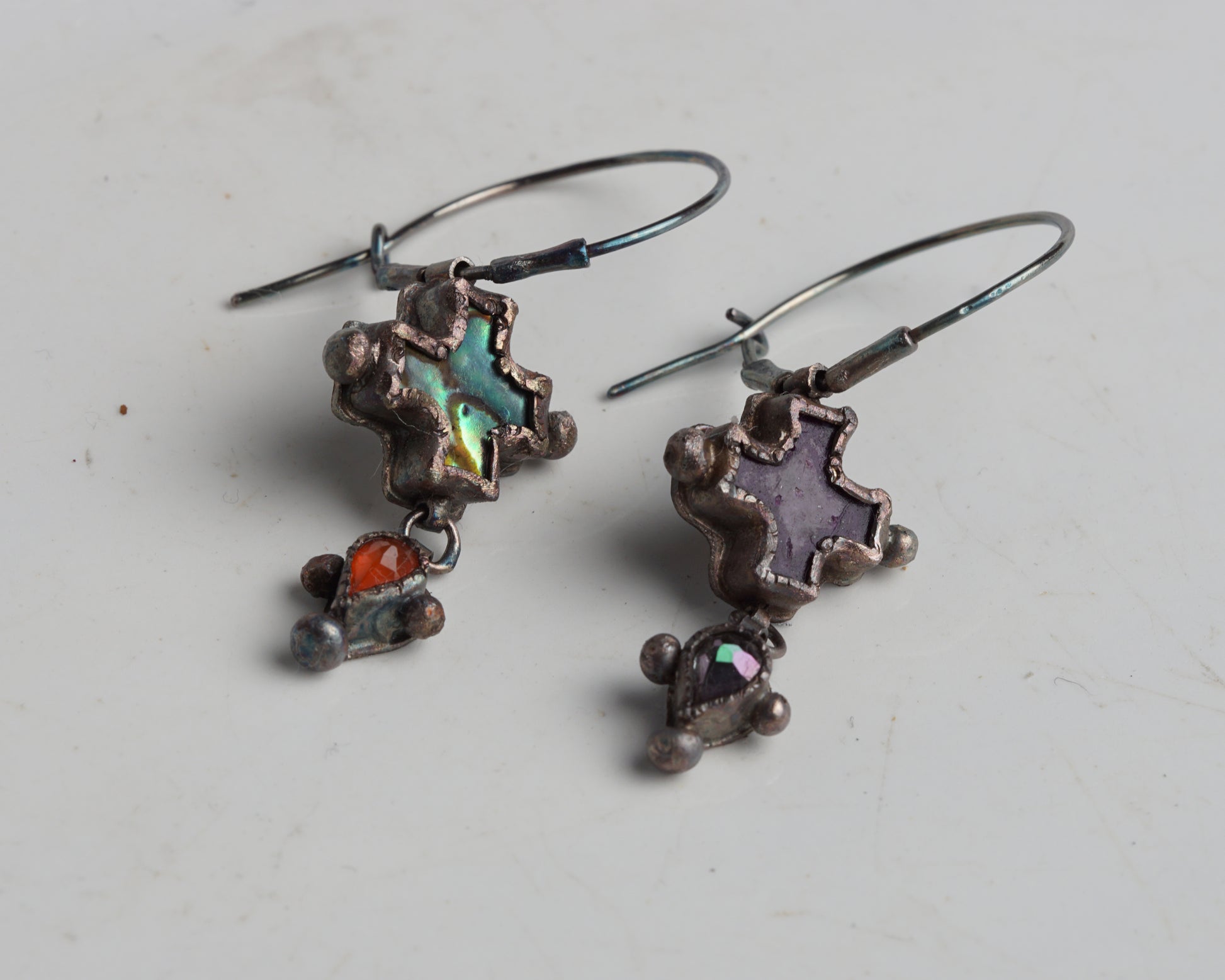 These earrings feature mismatched stones: one showcases luminous mother-of-pearl paired with vibrant orange carnelian, while the other presents Atlantisite with a faceted pear-shaped purple mystic topaz. Crafted in an antique style, they include a reliable clasp for secure wear.