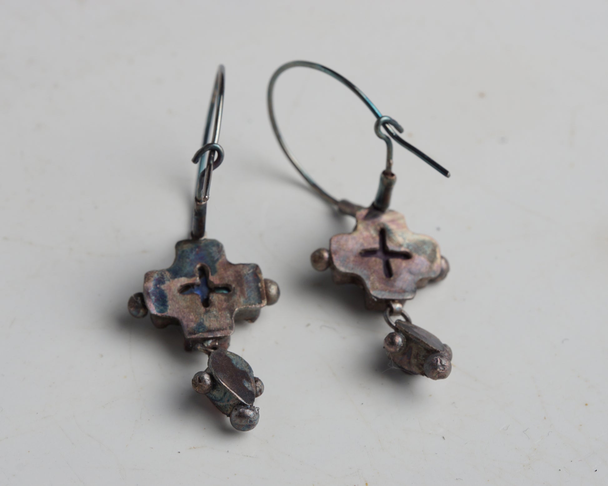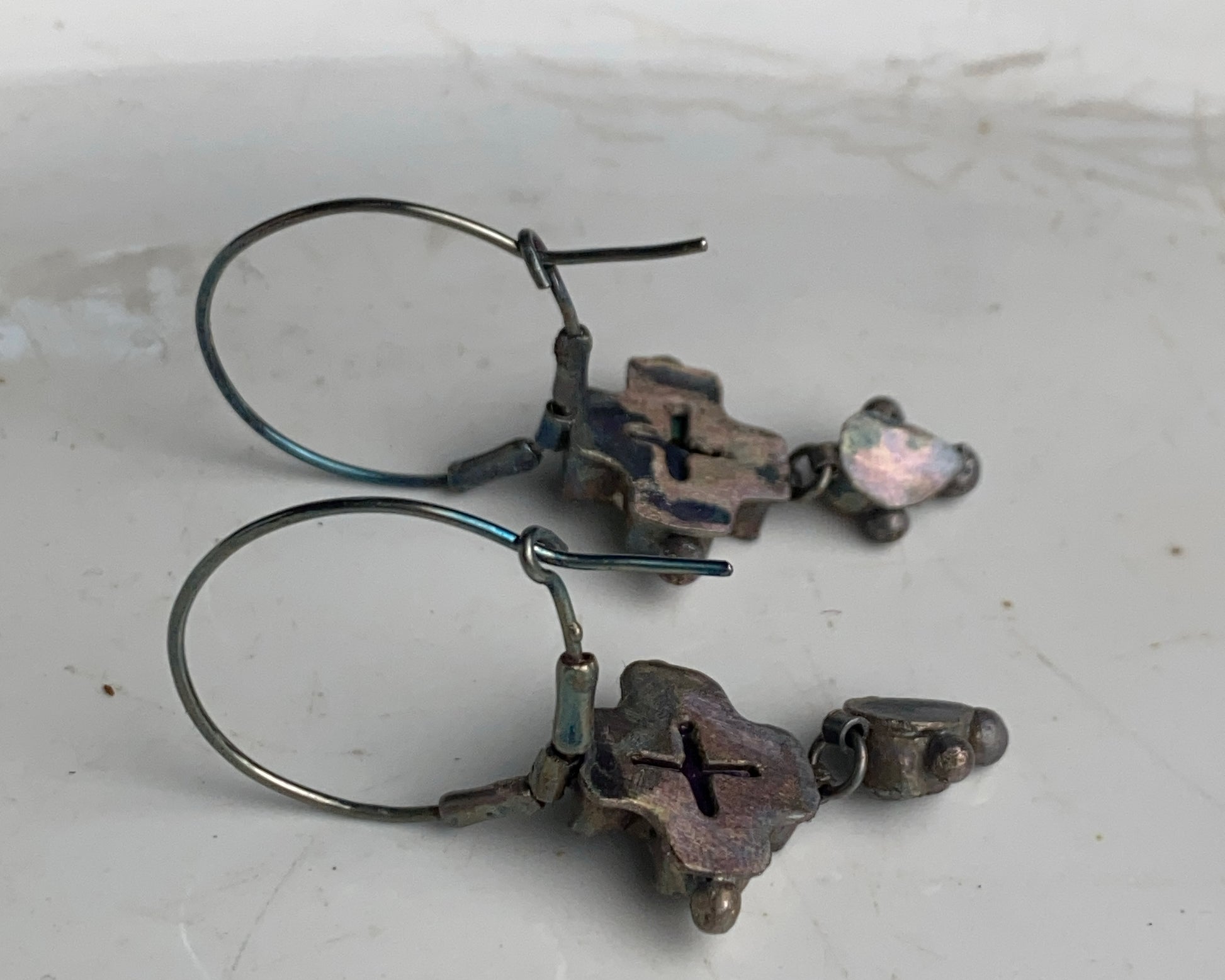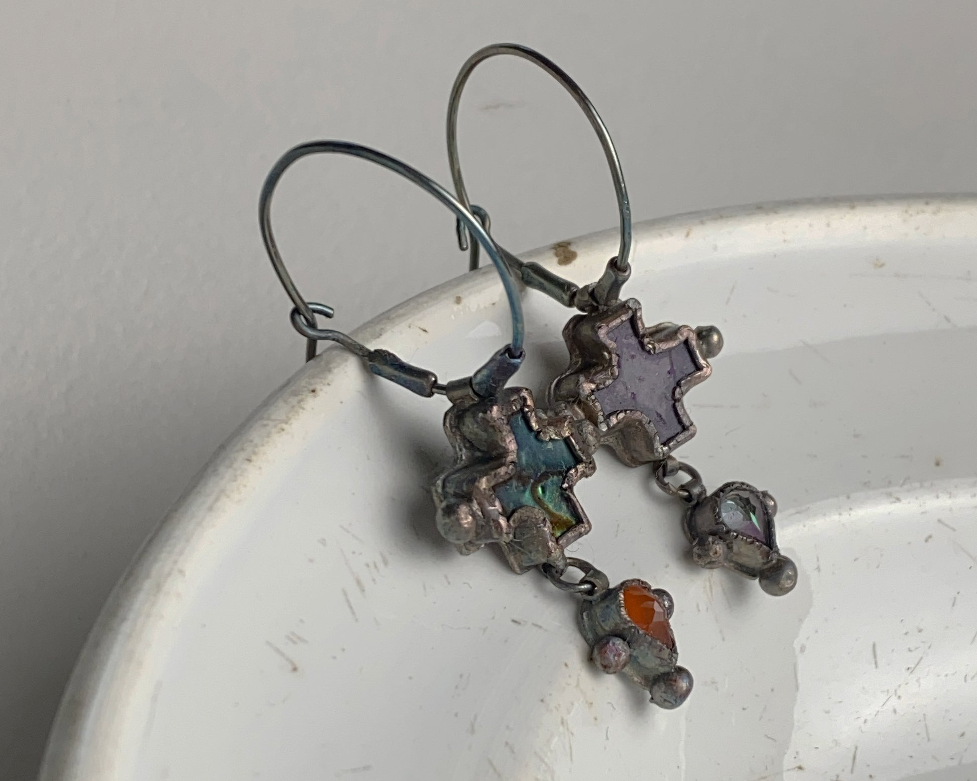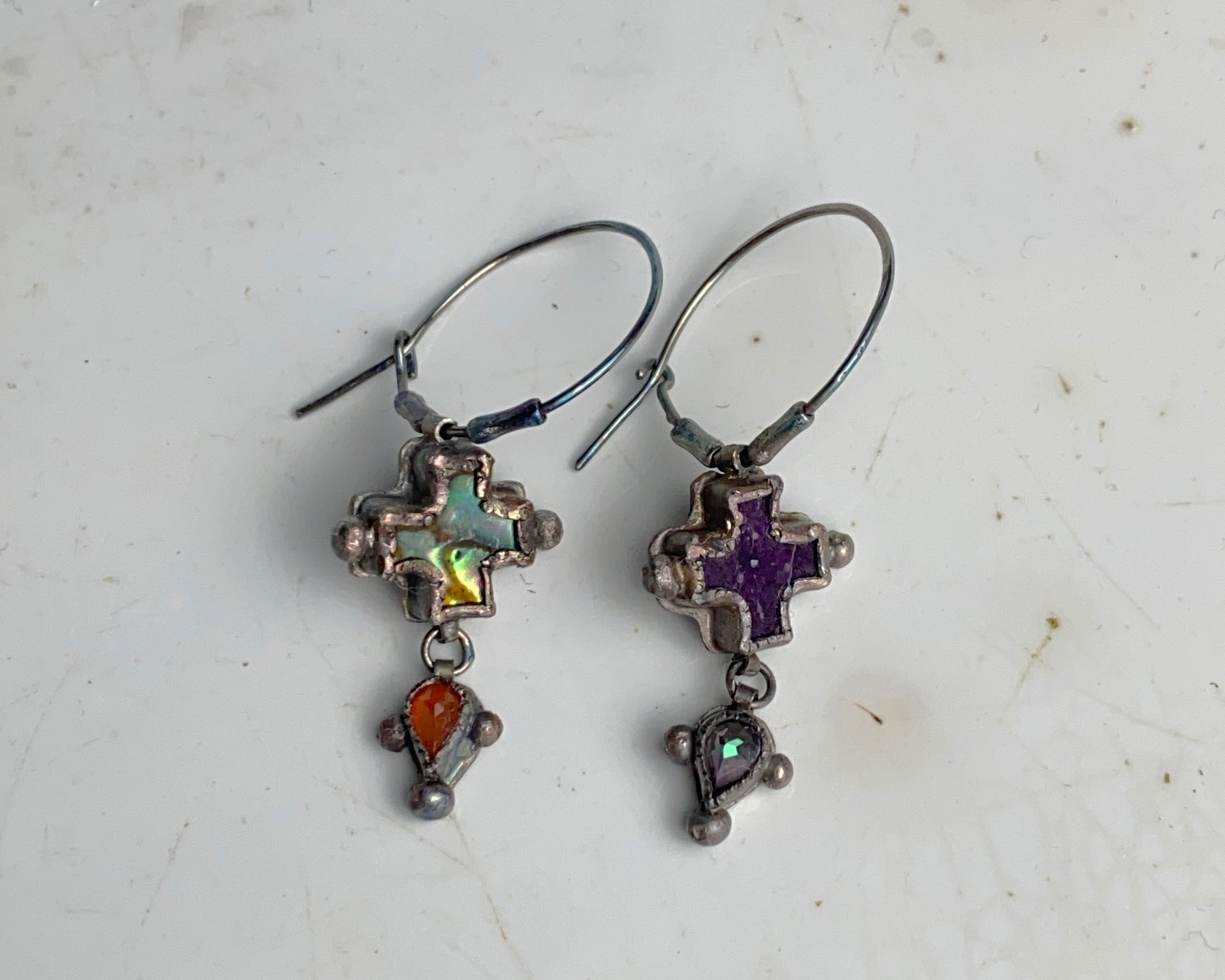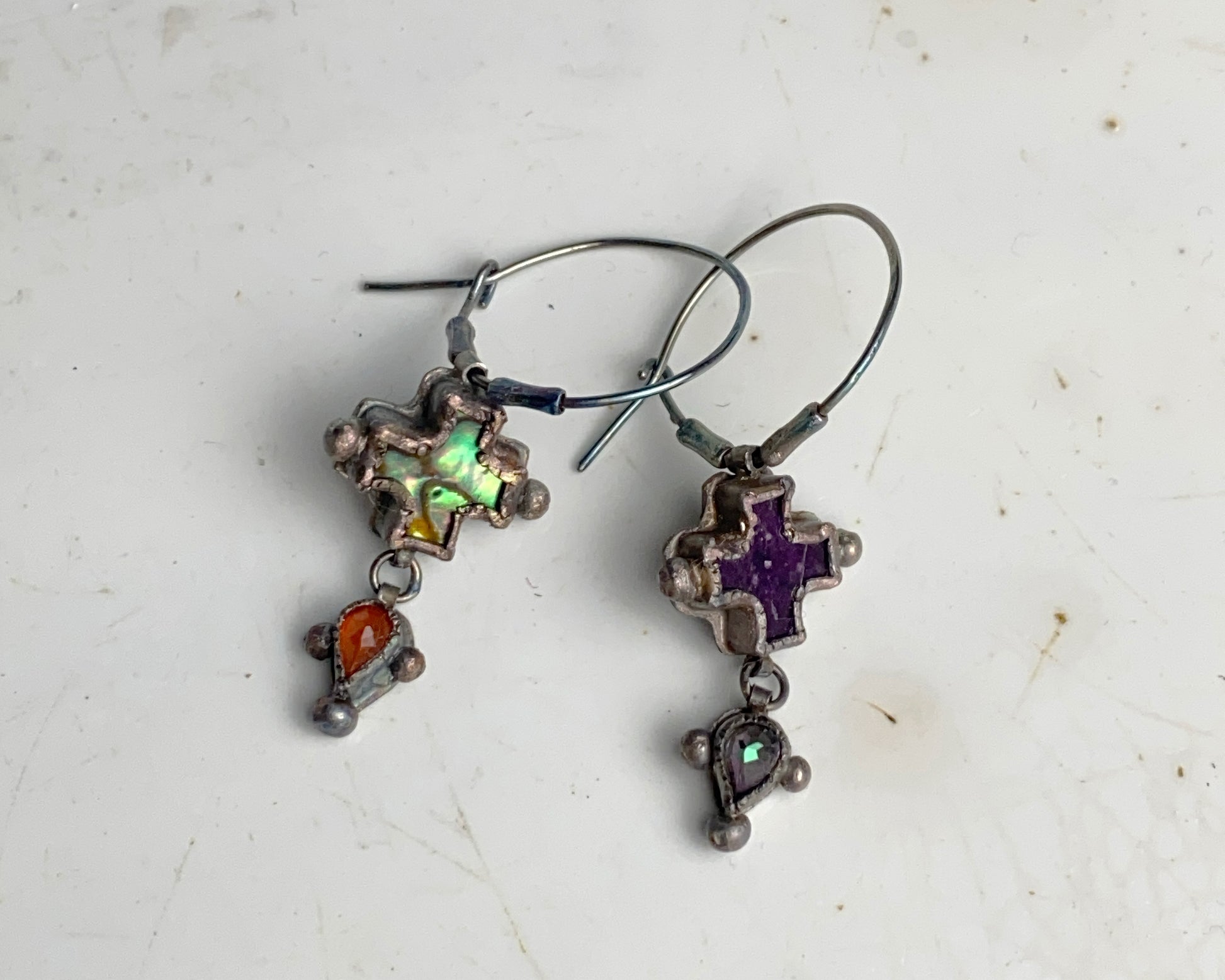 These earrings feature mismatched stones: one showcases luminous mother-of-pearl paired with vibrant orange carnelian, while the other presents Atlantisite with a faceted pear-shaped purple mystic topaz. Crafted in an antique style, they include a reliable clasp for secure wear.