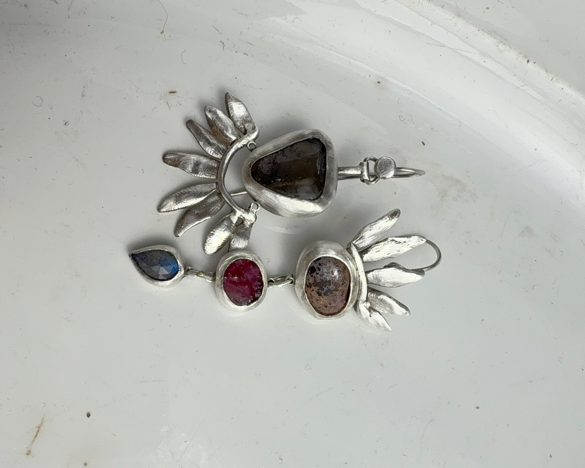 Handcrafted sterling silver earrings featuring asymmetric designs with natural gemstones. The left earring showcases a Iolite with radiating silver petals, while the right displays a vertical composition of opal, ruby, and teardrop labradorite