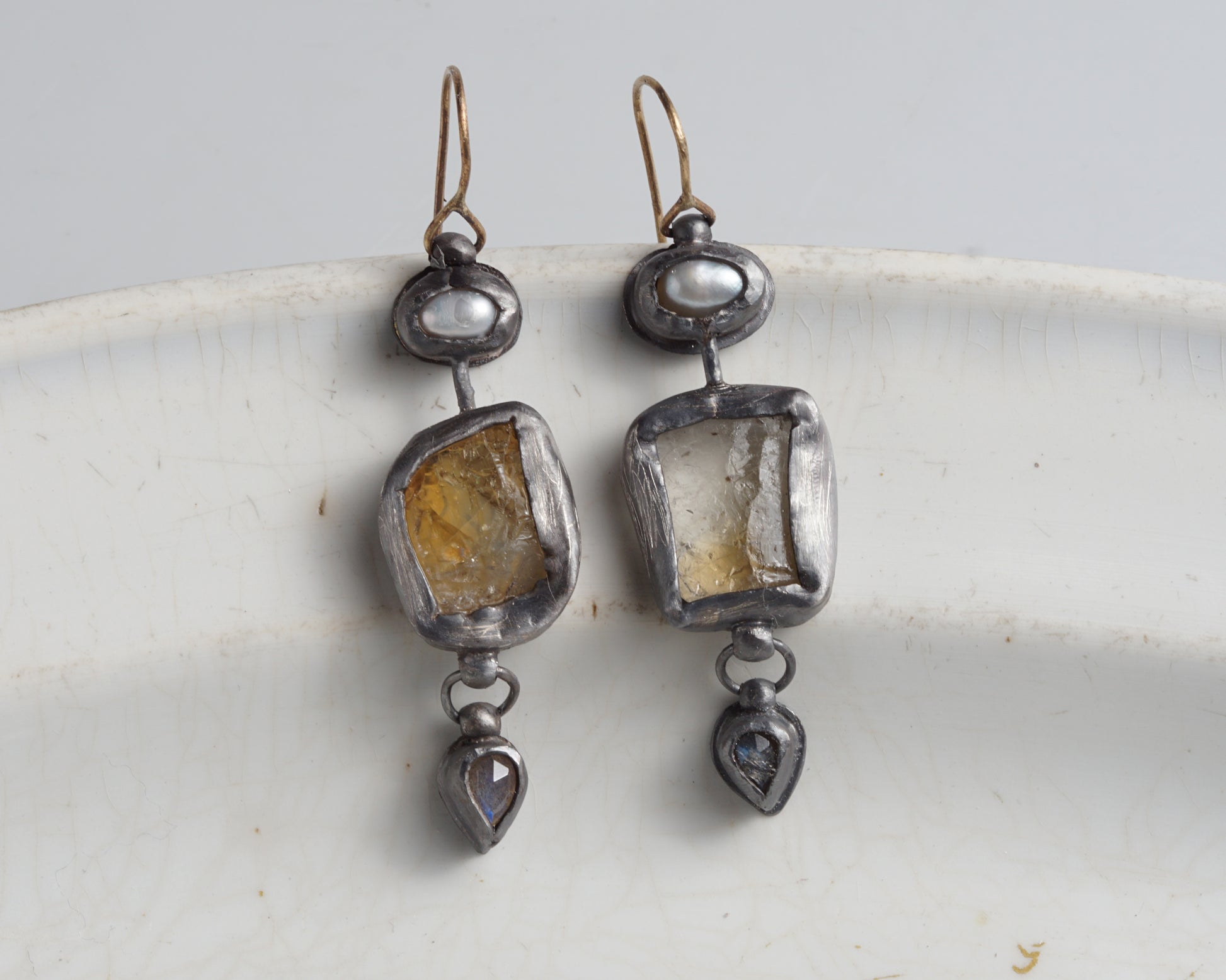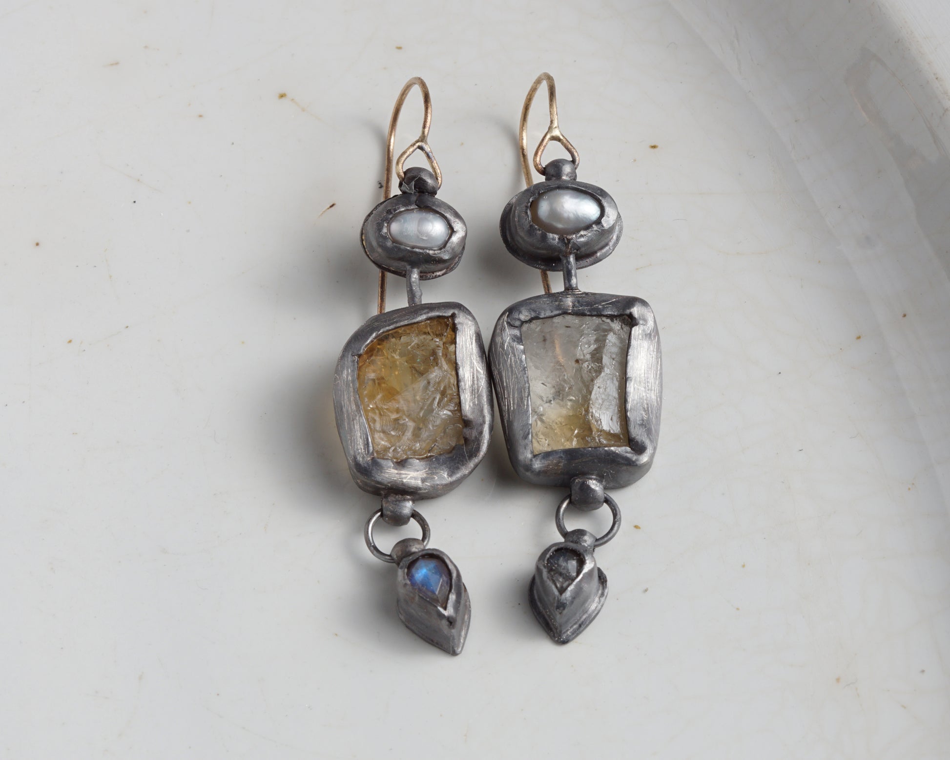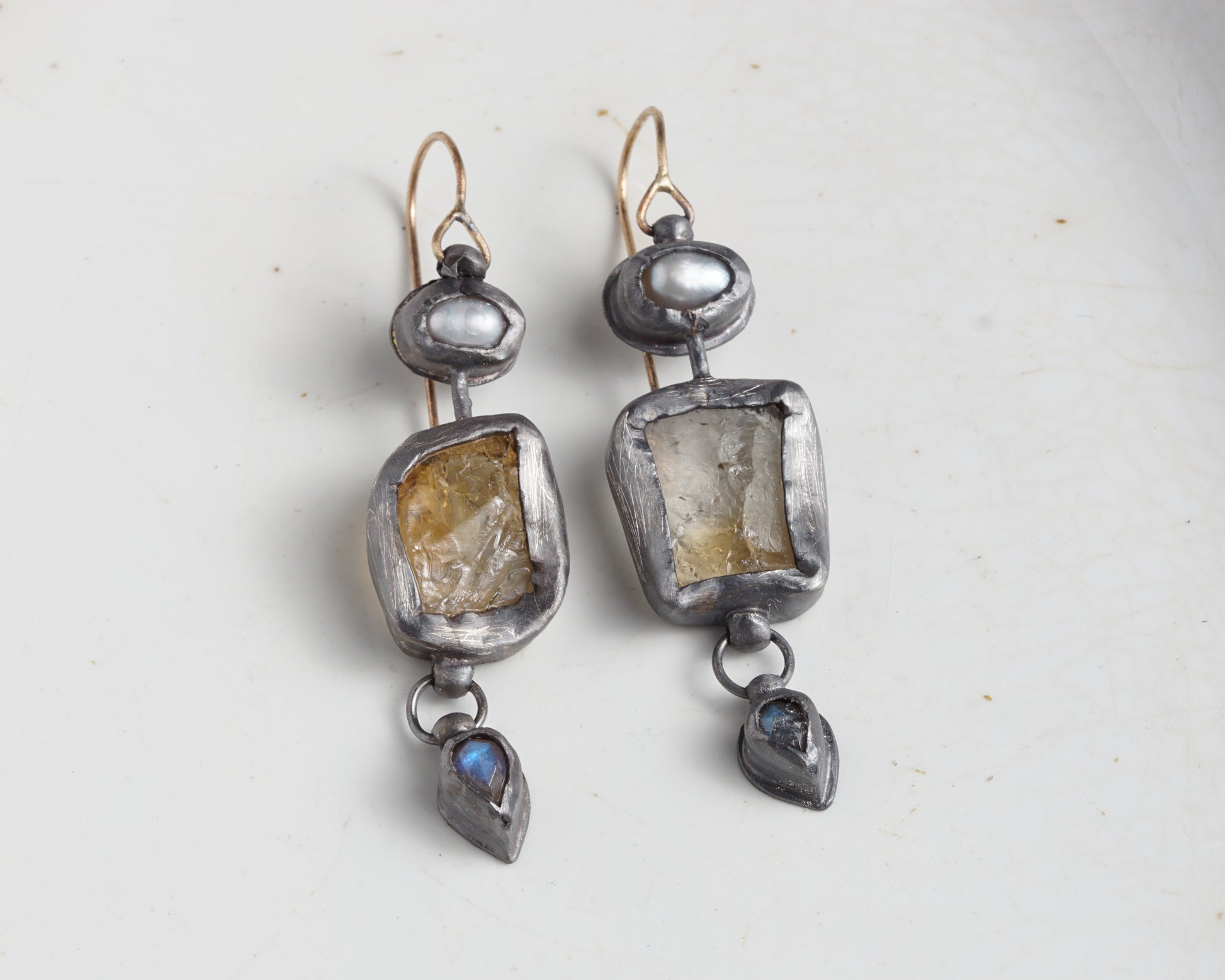 Handcrafted earrings made from 925 sterling silver and 585 gold. Rough citrine stones are paired with drops of labradorite and small freshwater pearls. Comfortable hooks are made of gold. The silver is oxidized, and the earrings retain visible traces of hand-crafting.
