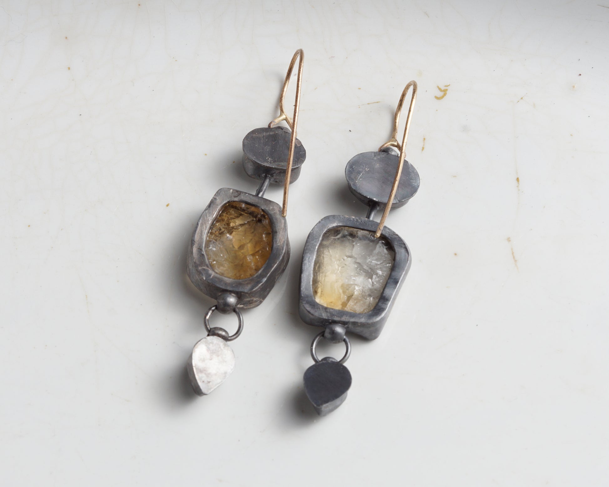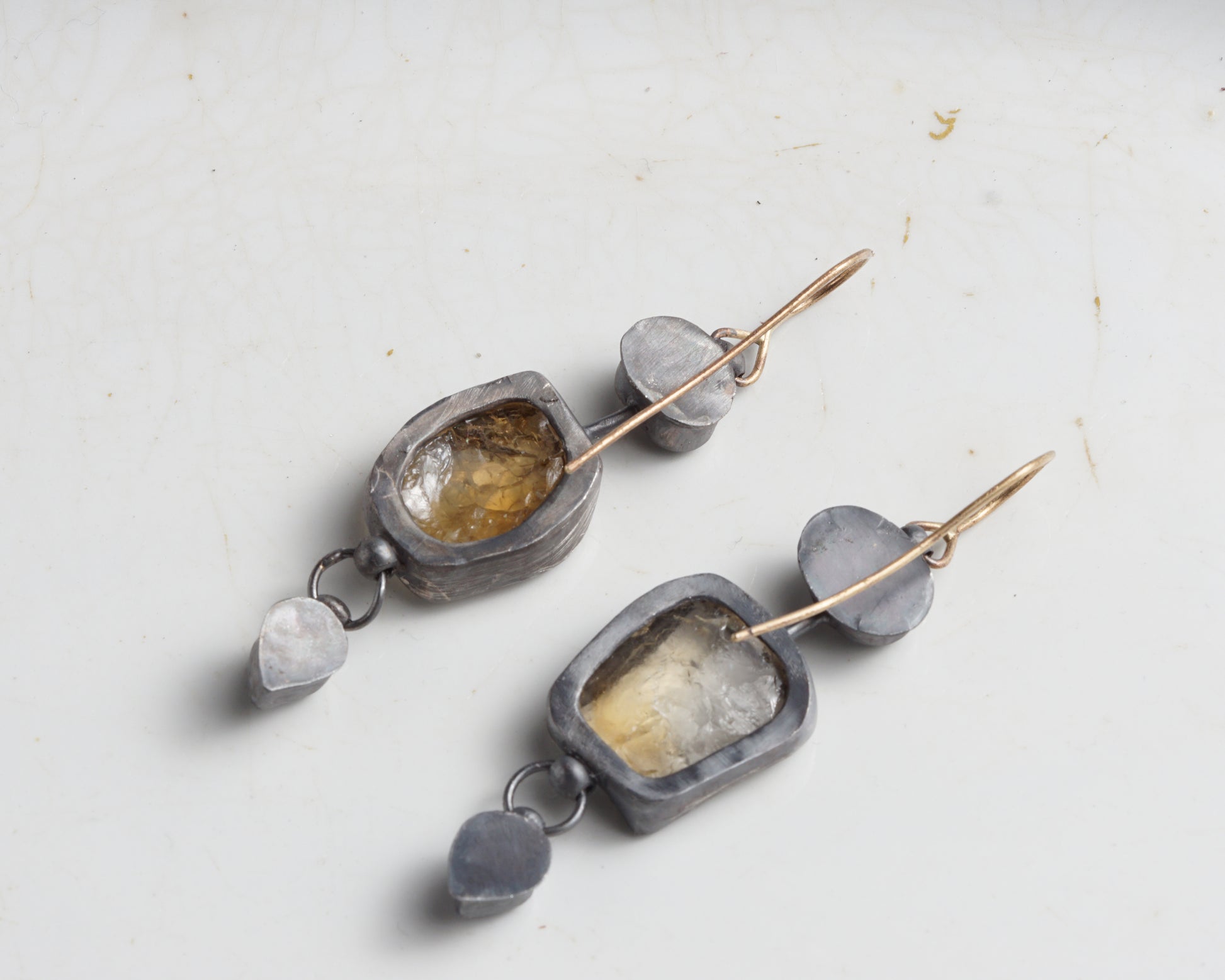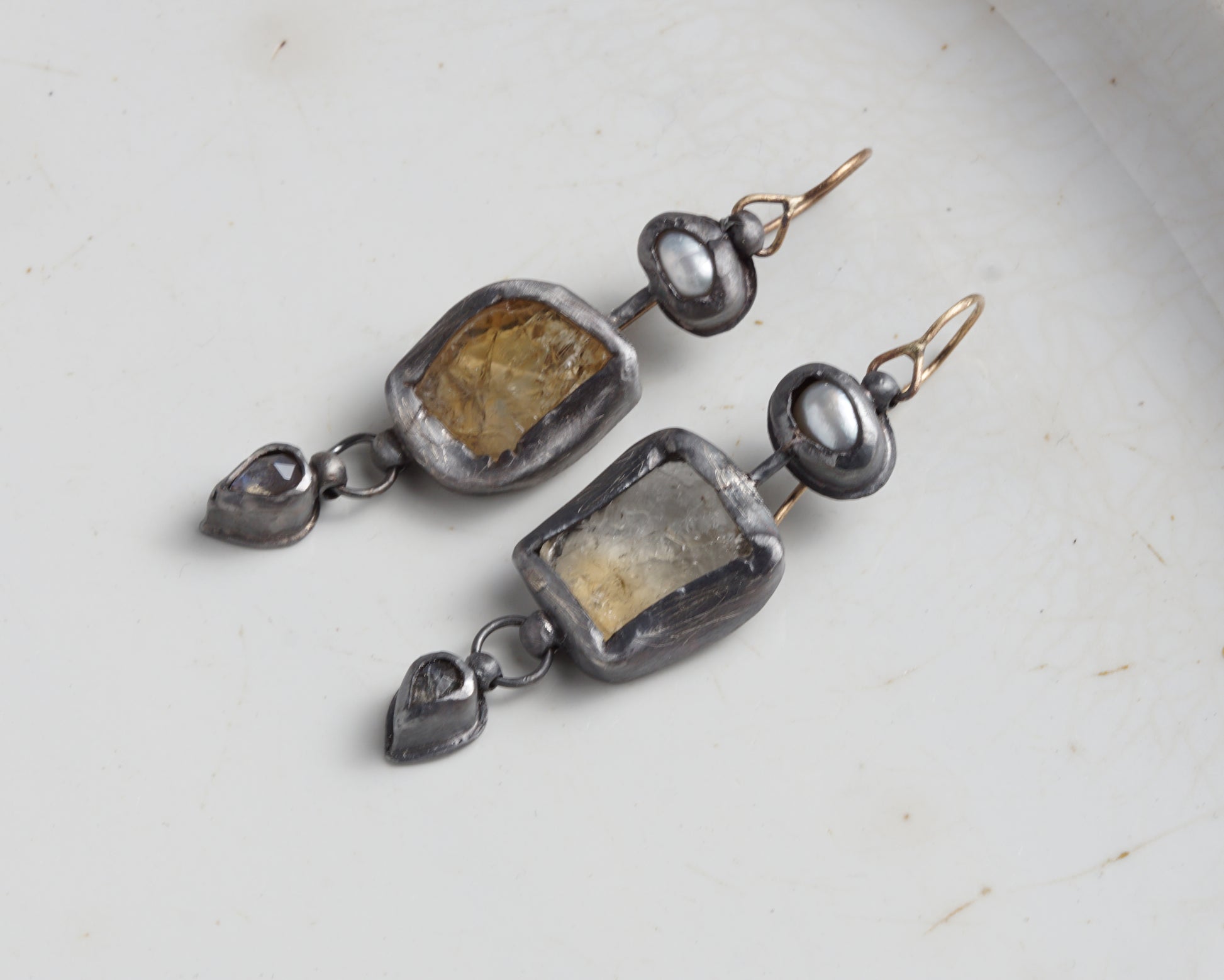 Handcrafted earrings made from 925 sterling silver and 585 gold. Rough citrine stones are paired with drops of labradorite and small freshwater pearls. Comfortable hooks are made of gold. The silver is oxidized, and the earrings retain visible traces of hand-crafting.