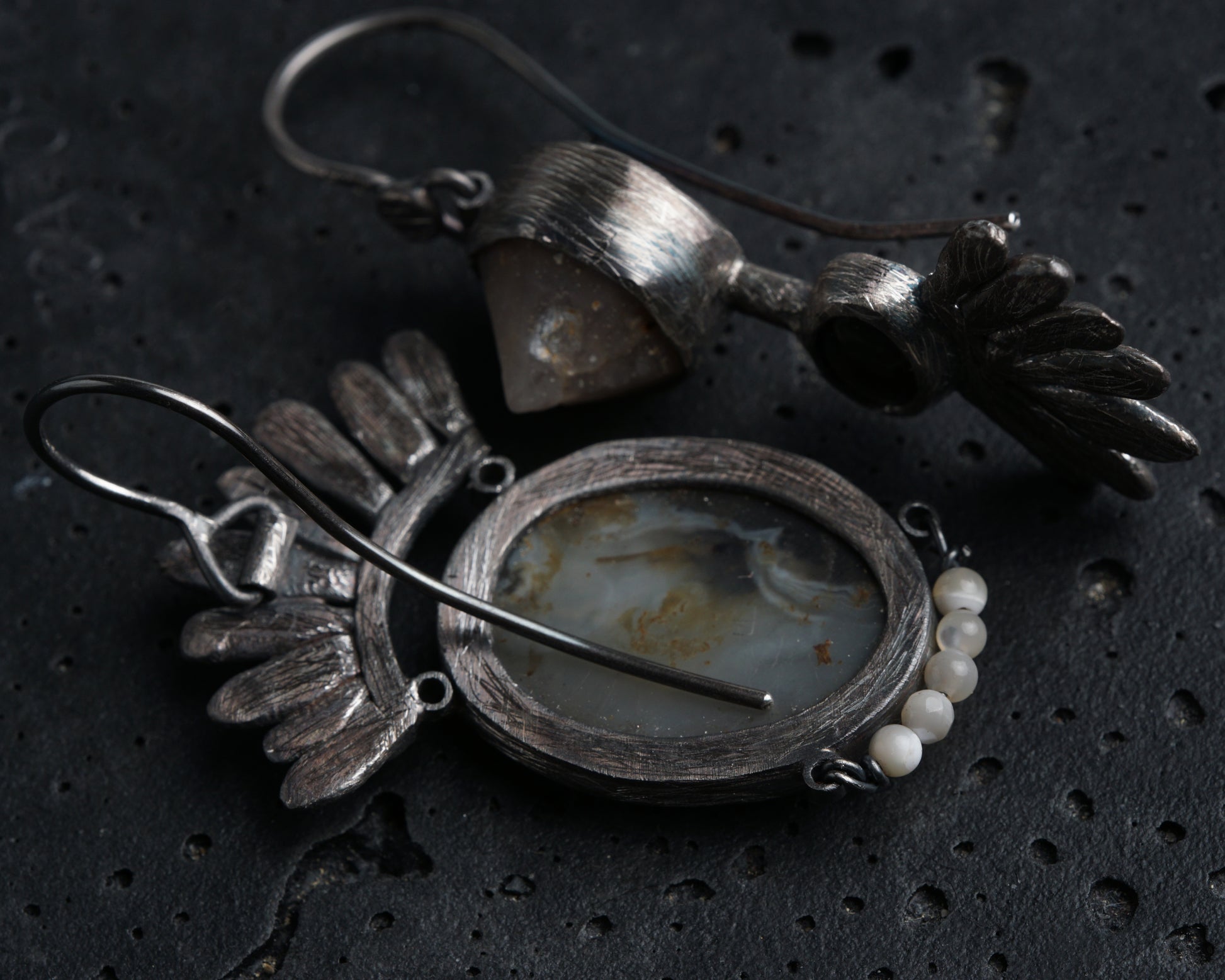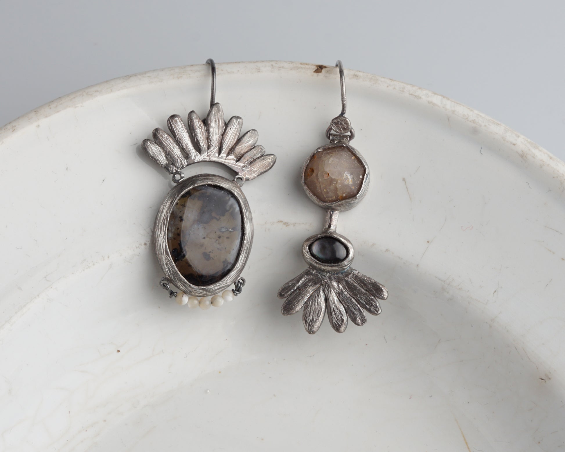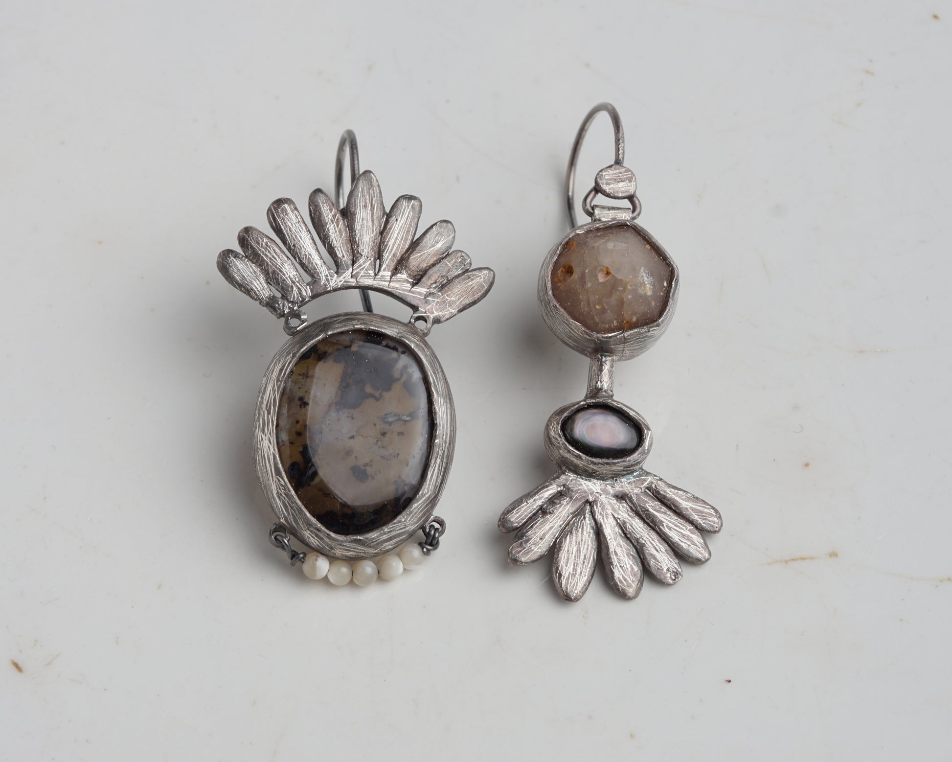 Mismatched silver earrings featuring dendritic agate, small mother-of-pearl beads, natural freeform Betta quartz, and black mother-of-pearl. Handcrafted as a one-of-a-kind piece.