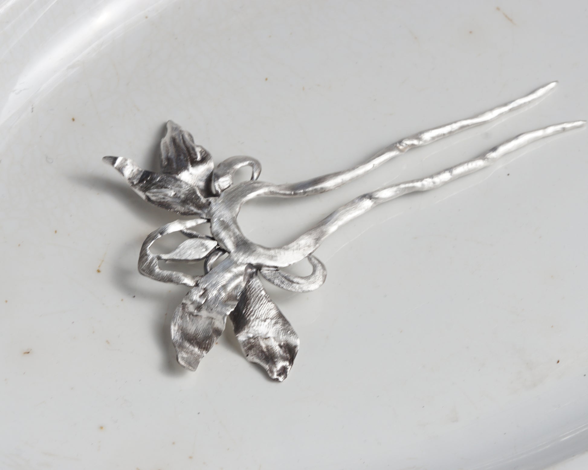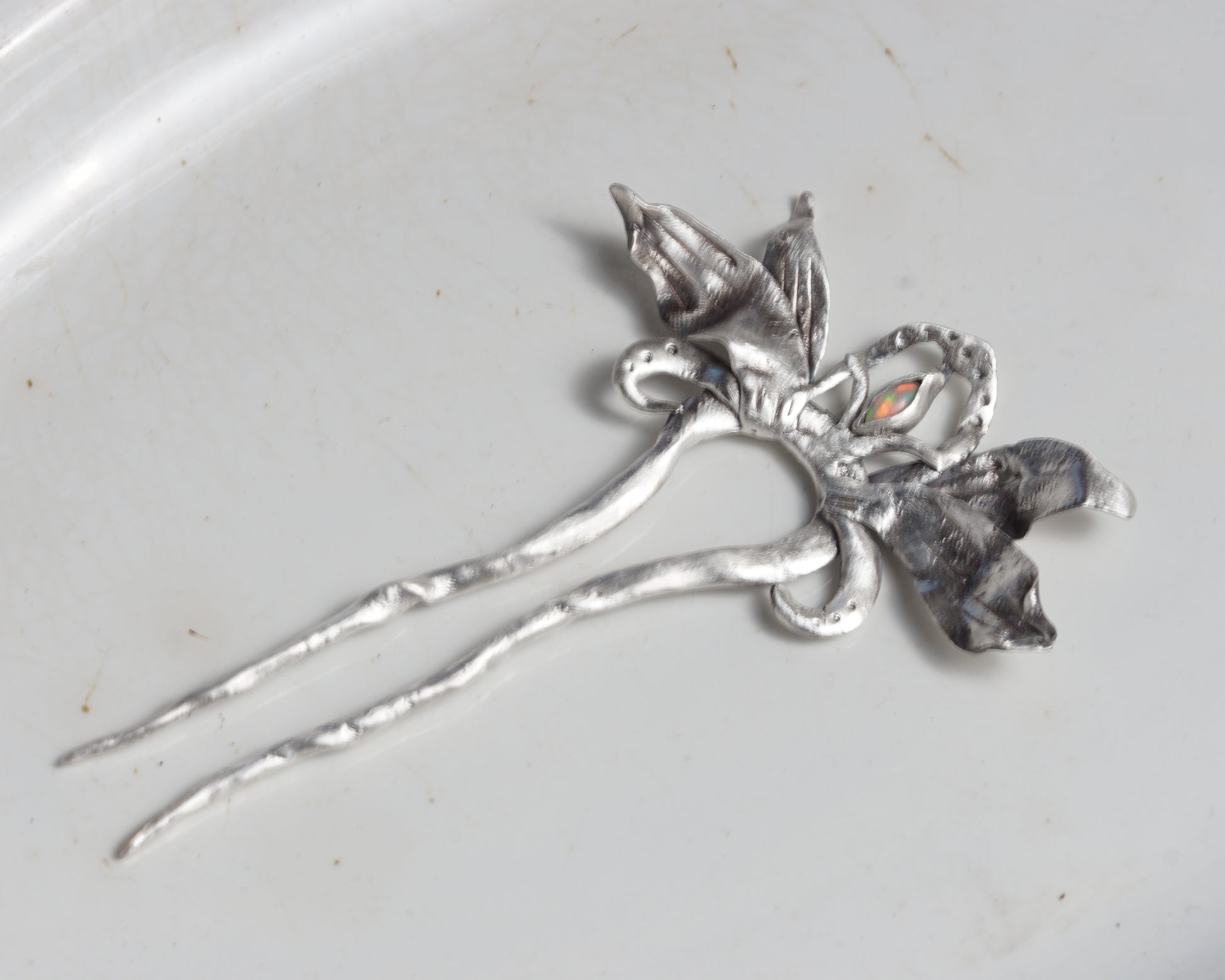 Handcrafted sterling silver hair pin shaped like an elven flower. The design features delicate organic curves and sculptural petals surrounding an iridescent opal. Each element is hand-sculpted, giving the piece a raw, natural texture that evokes ancient woodland aesthetics and a sense of mysticism.