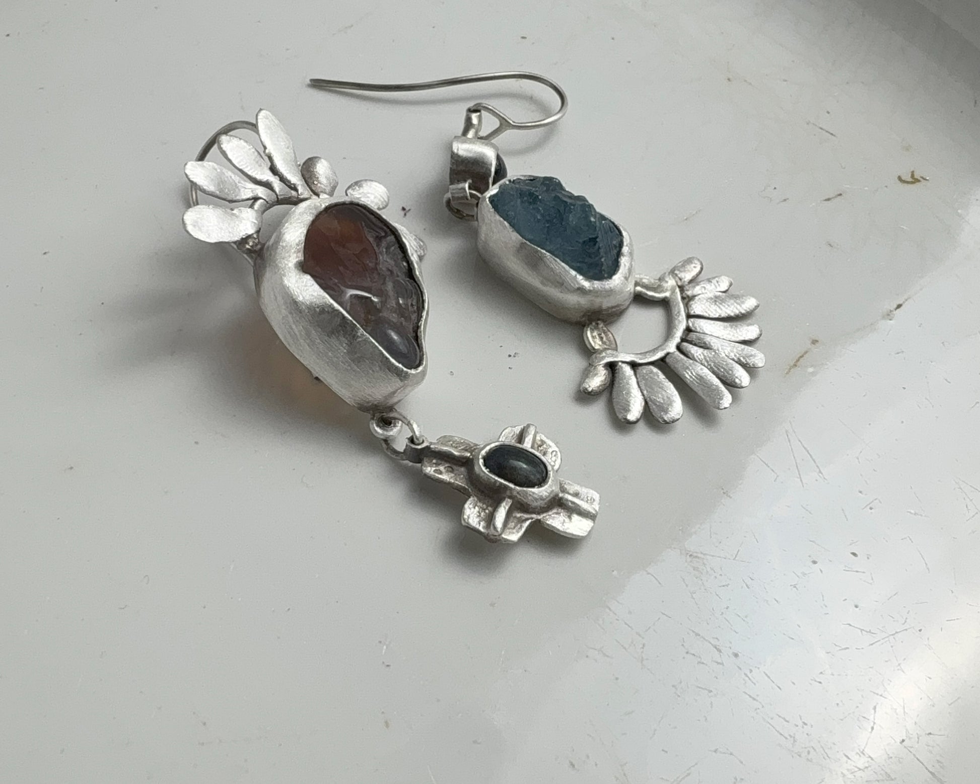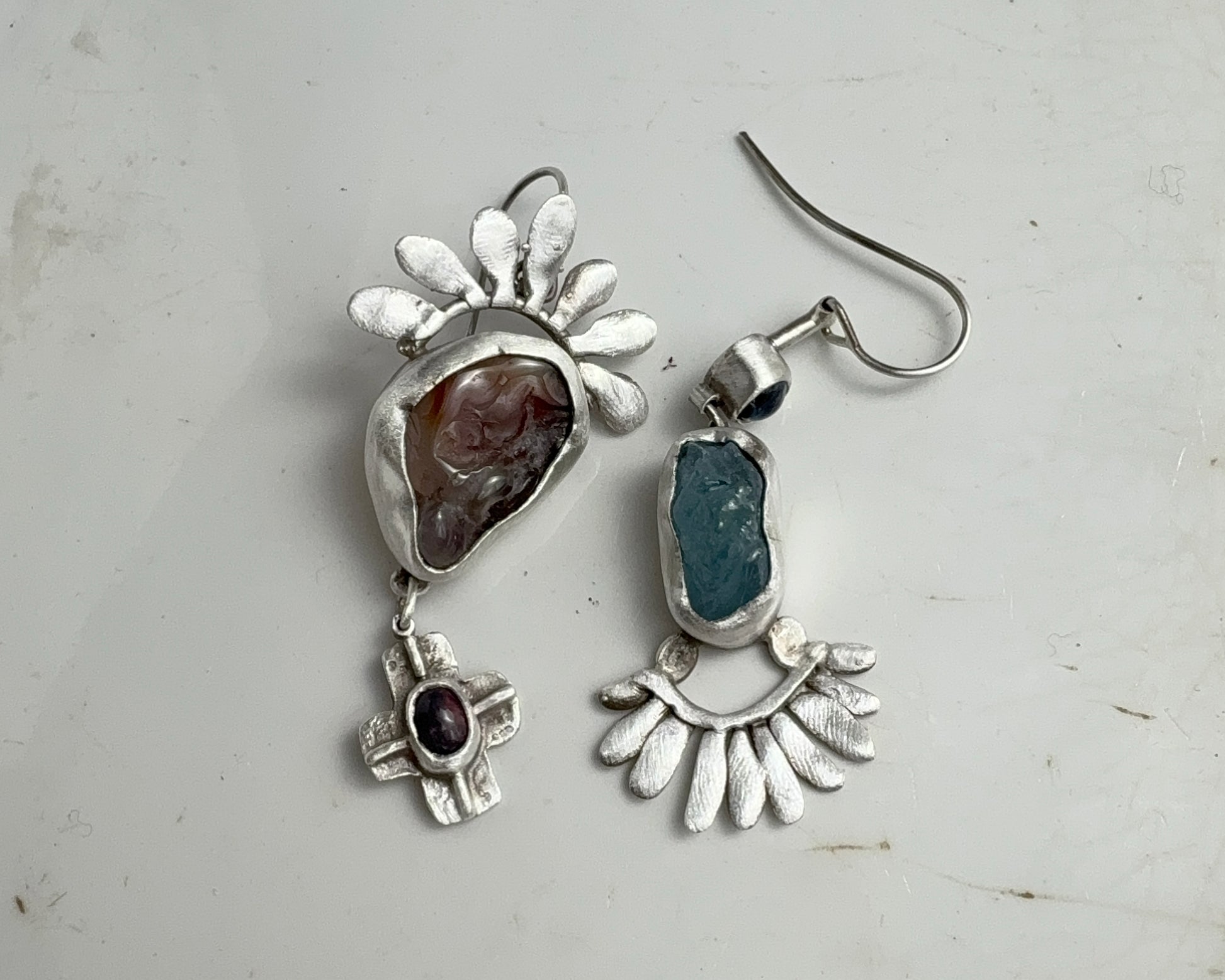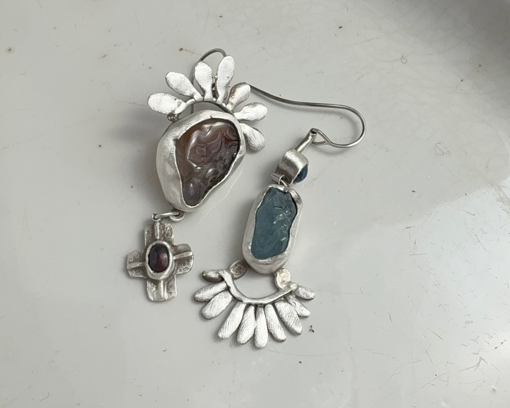 One earring features a fiery agate and a black opal set in silver with a small cross-shaped pendant.