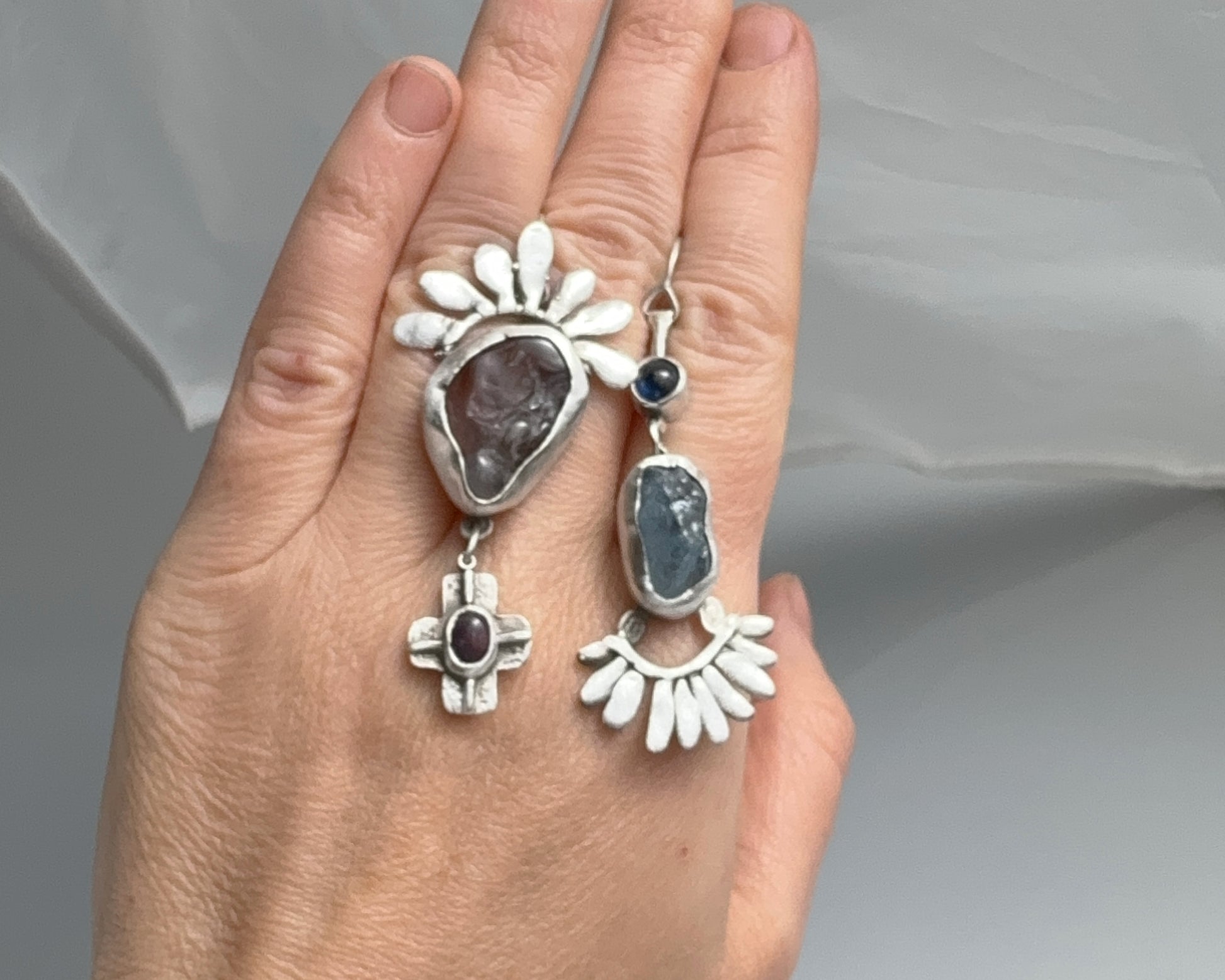 Each stone is hand-set in sterling silver with textured, petal-like elements that create a sense of balance between the two contrasting halves — fire and water.
