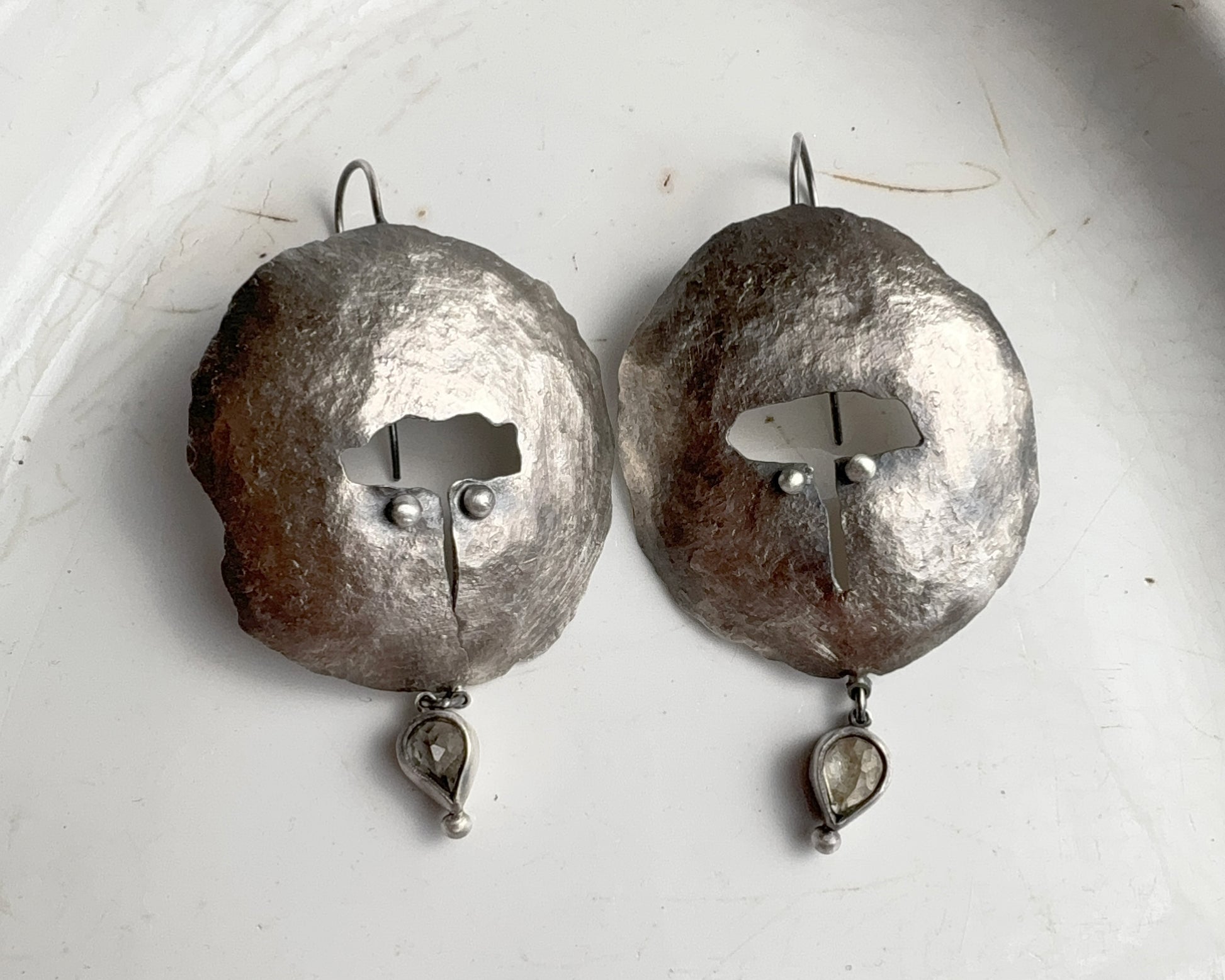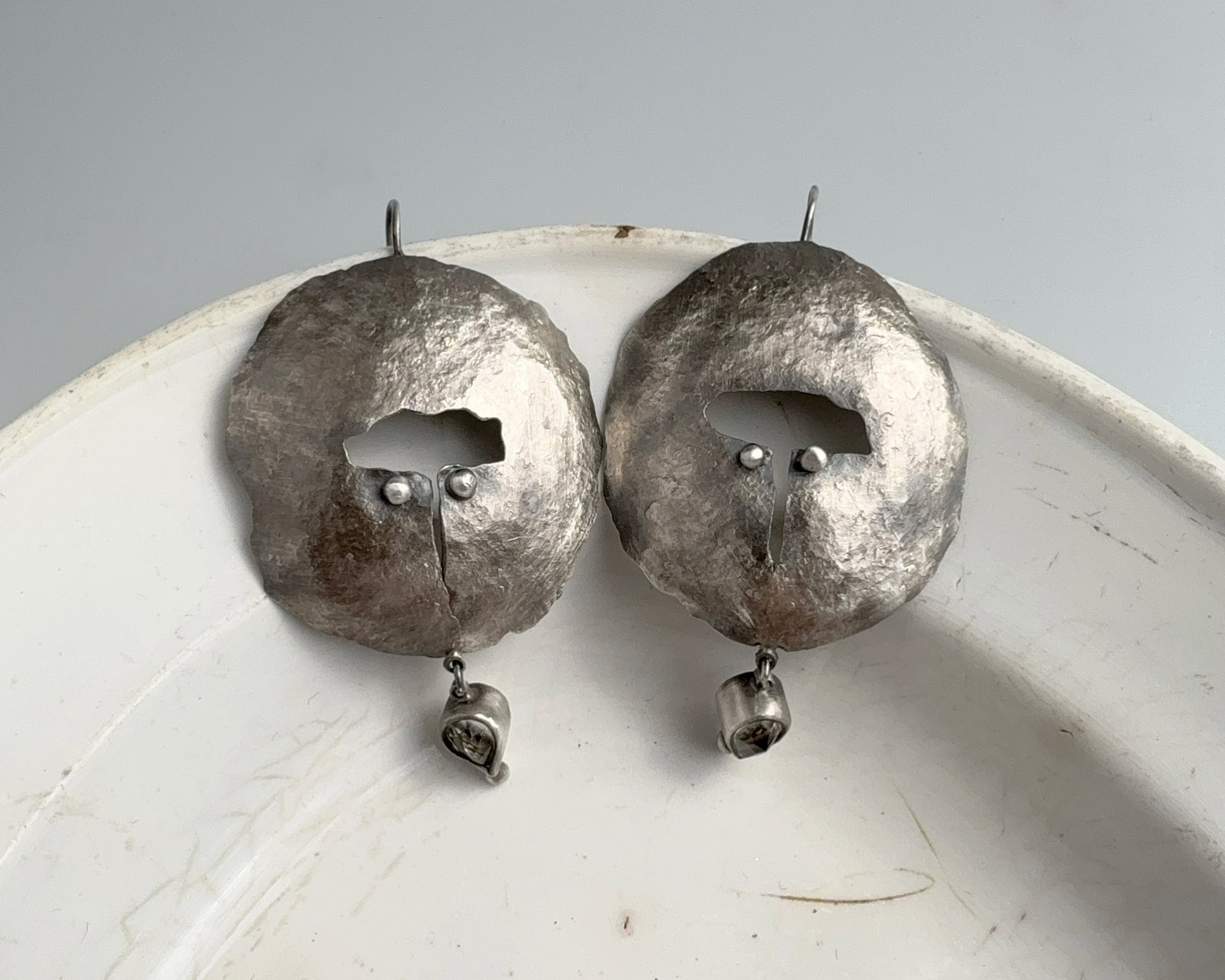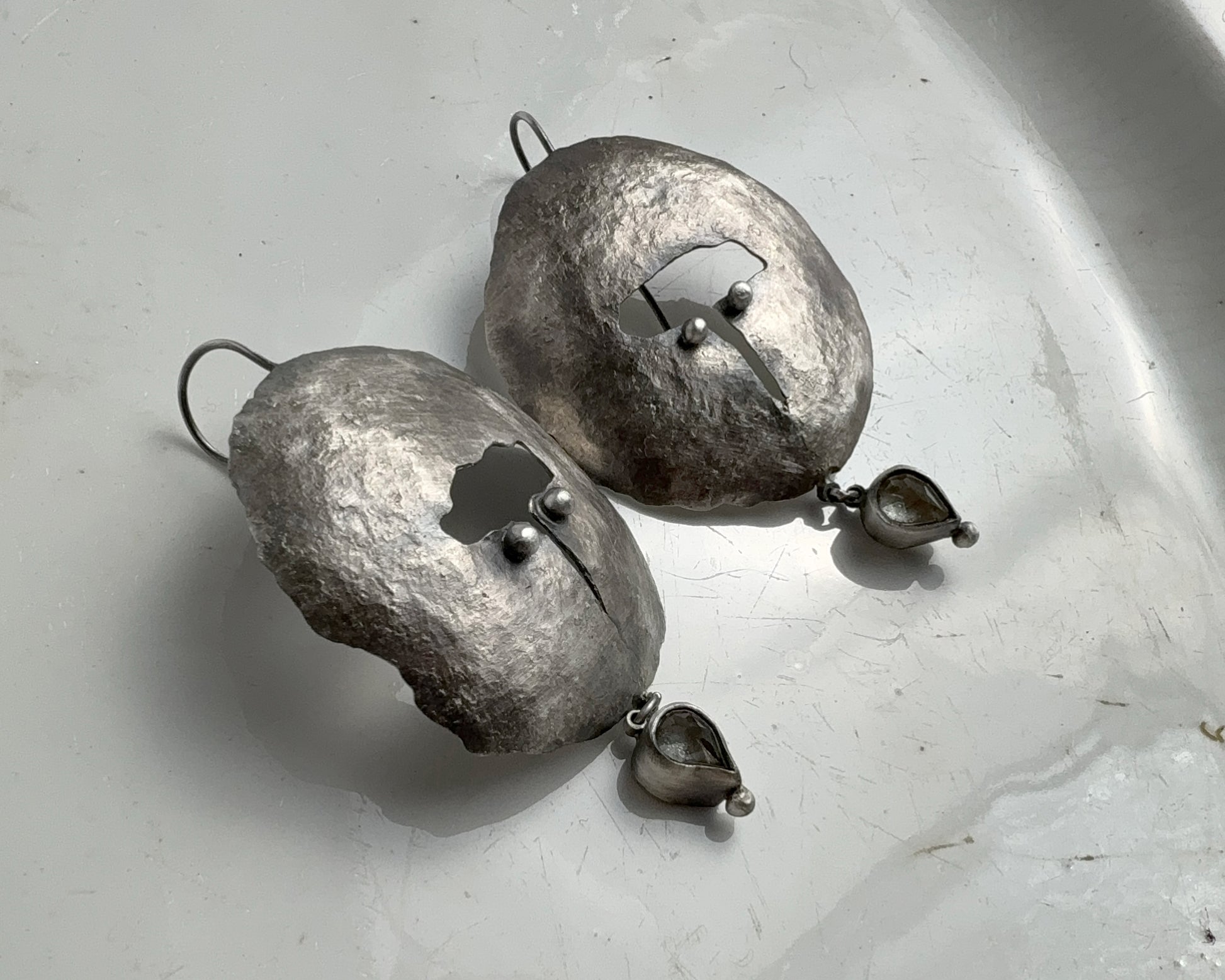 Hand-forged earrings made from oxidized 925 sterling silver. Each piece is shaped by hand, preserving a raw, uneven surface. Finished with pear-shaped lemon quartz, set as a subtle moving detail below the main form.