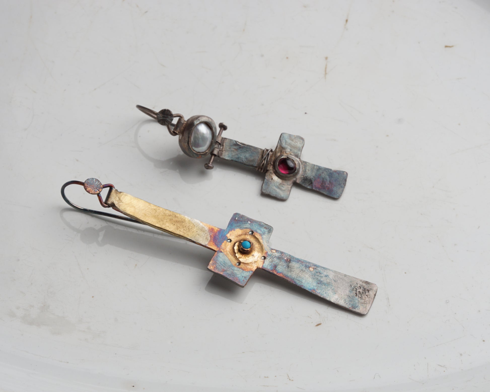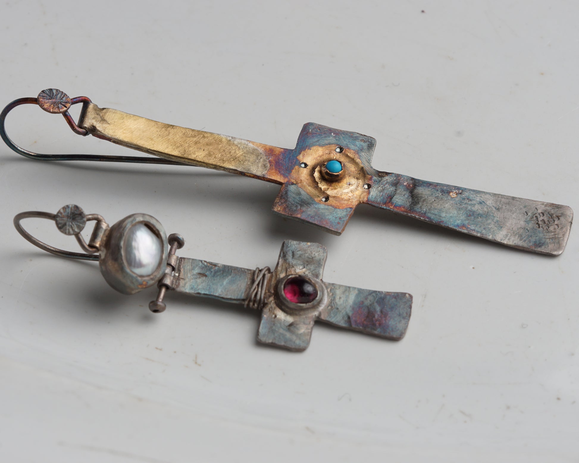 A pair of earrings made from oxidized silver, partially coated with 14k gold, with additional 14k gold details. Baroque pearls, garnet, and a small turquoise complete the design, making each pair one of a kind.