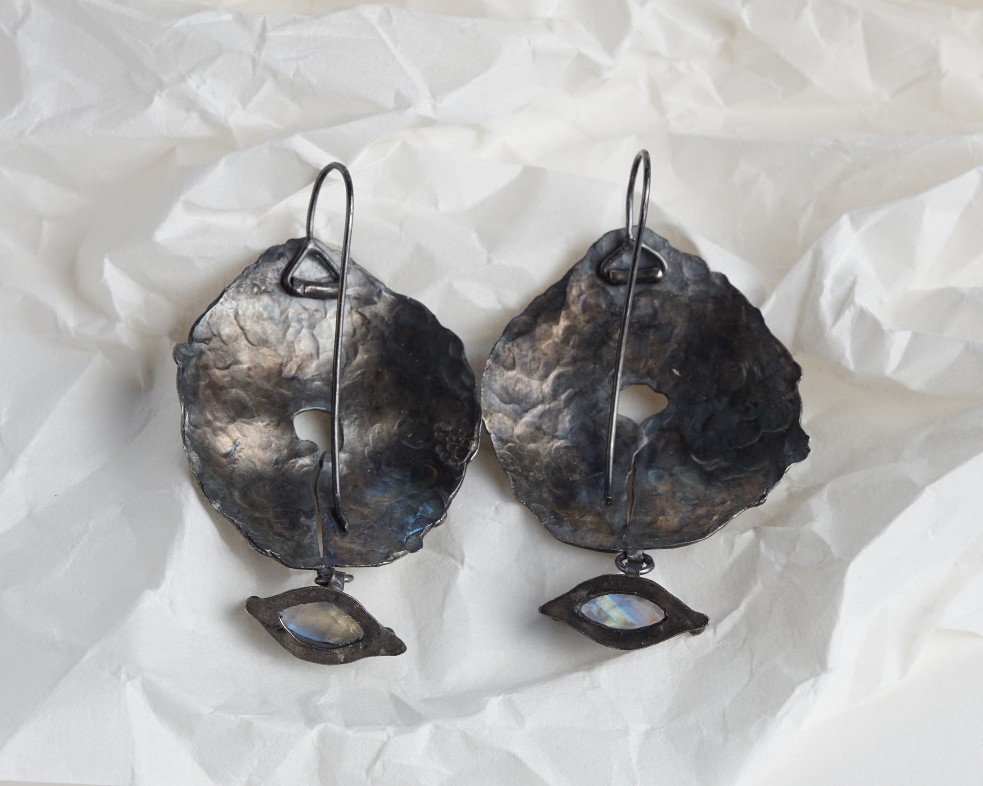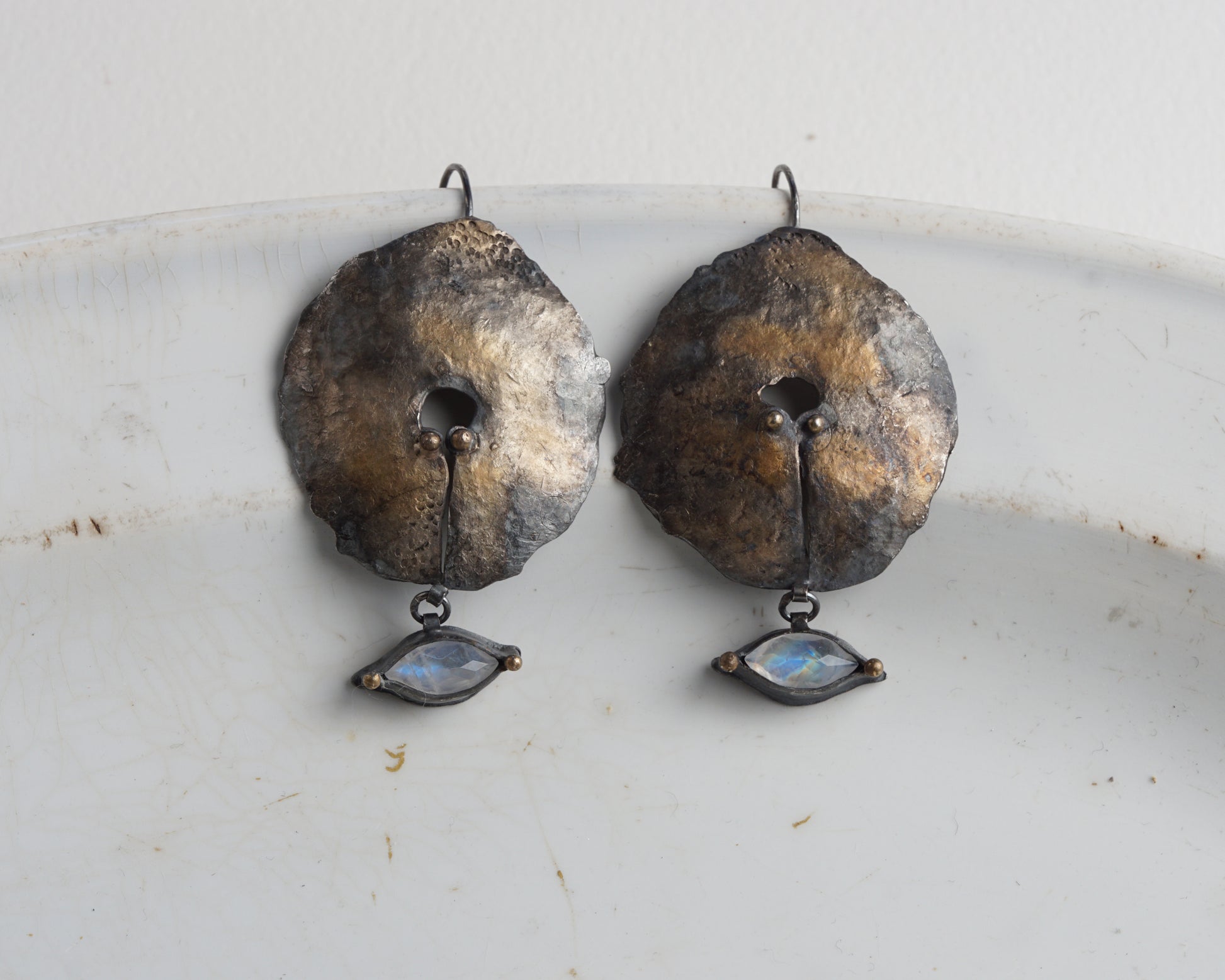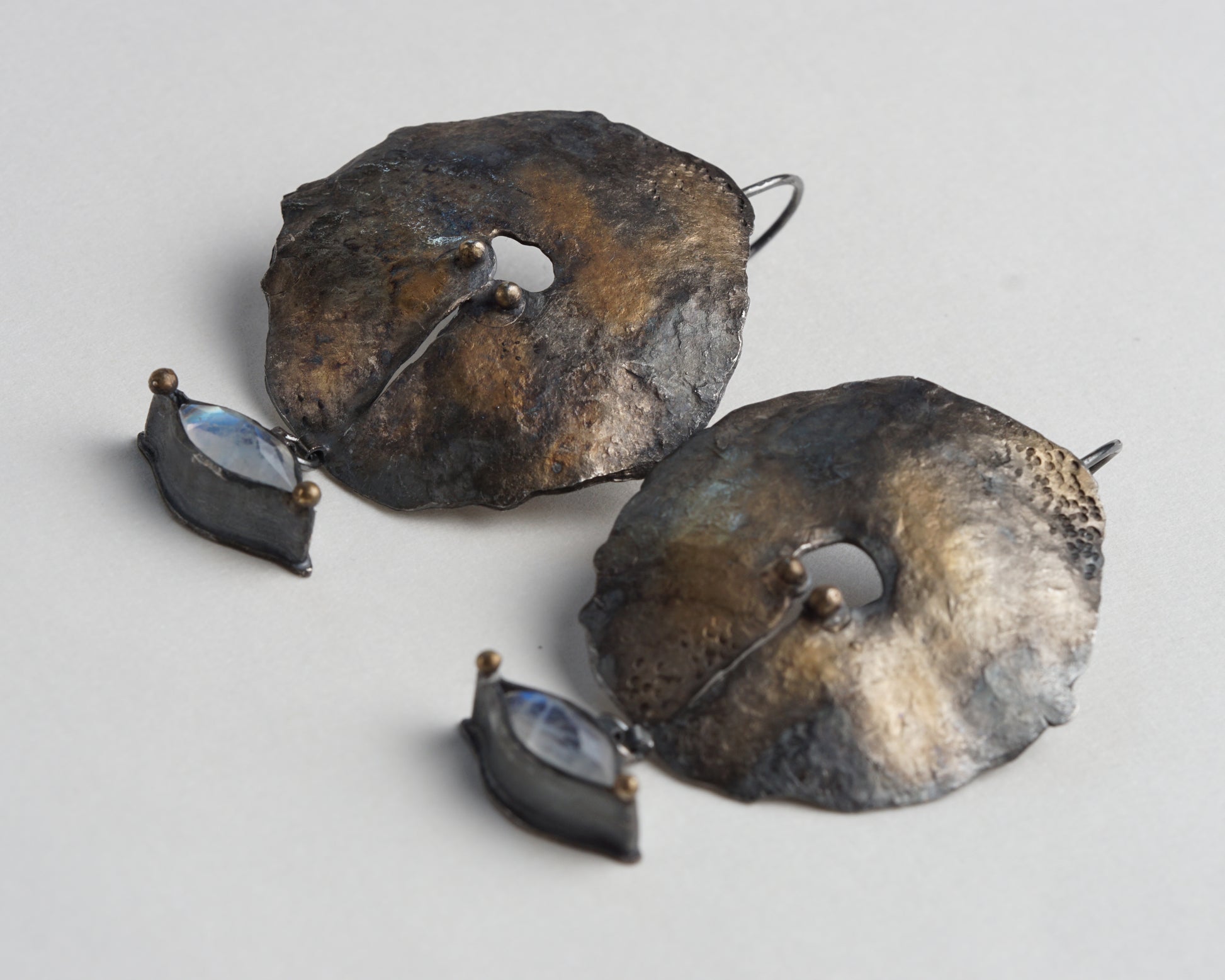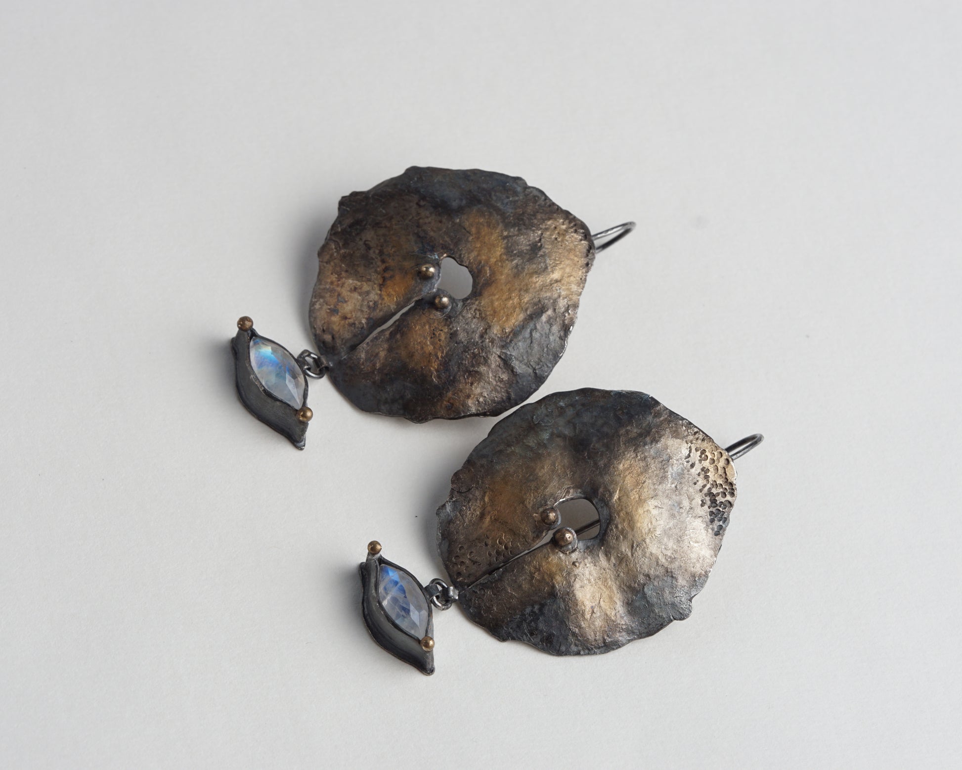 Handcrafted forged earrings featuring genuine moonstone gems. Made from sterling oxidized silver with 24-karat gold plating. Each piece is individually forged and shaped by hand, creating unique textures and patterns in the metal surface. The moonstones are carefully set to complement the organic, sculptural form of the silver discs. The oxidized finish provides depth and contrast against the warm gold accents.