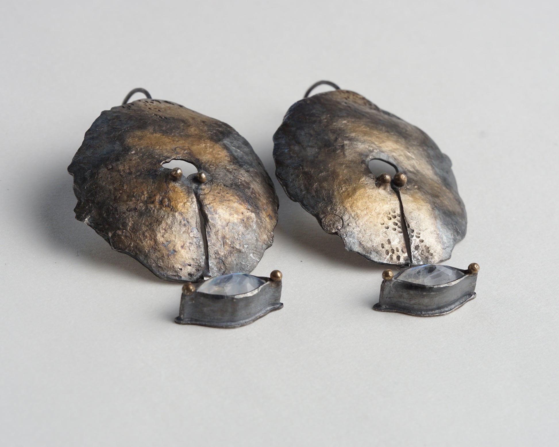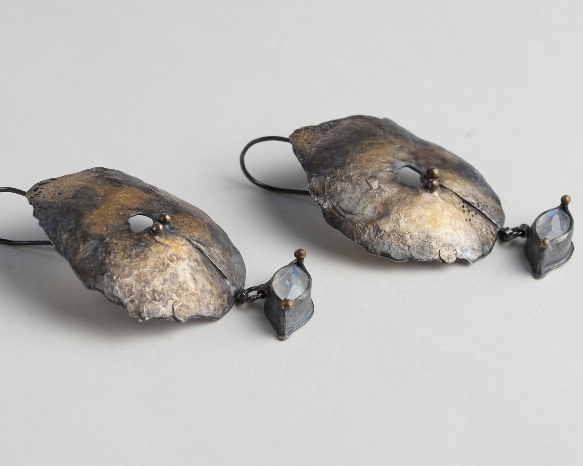 Hand-Forged Oxidized Silver Earrings with Moonstone and Gold Plating