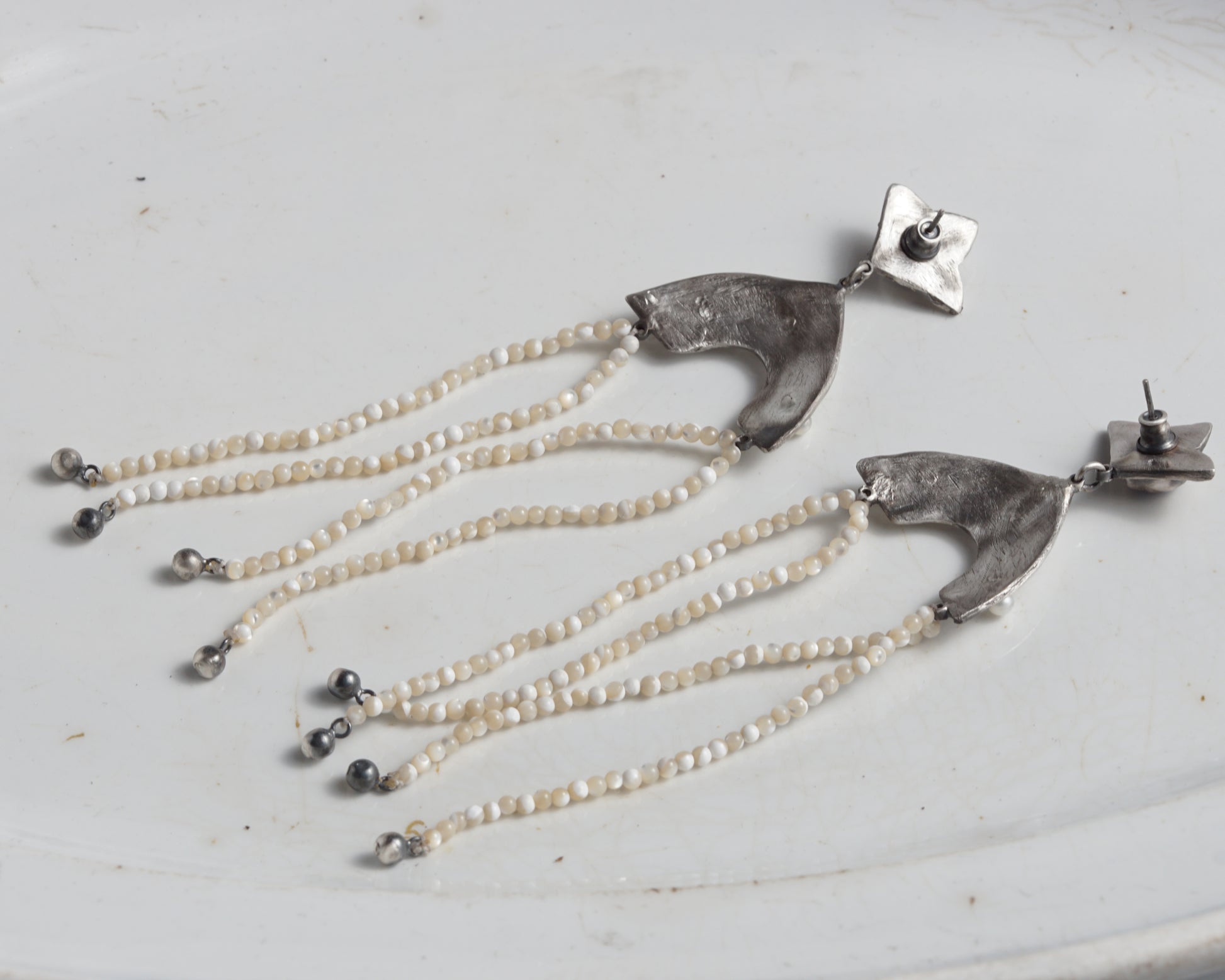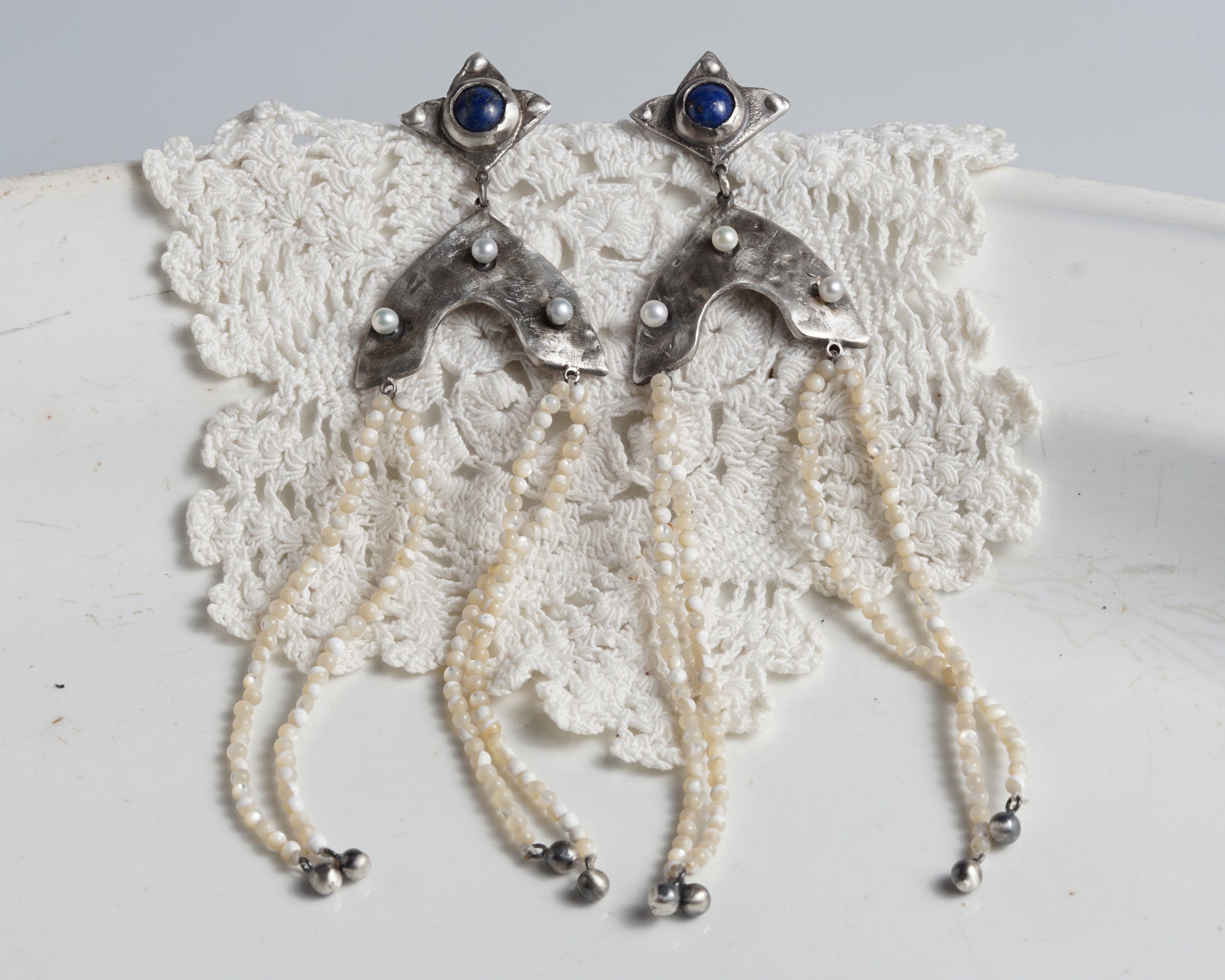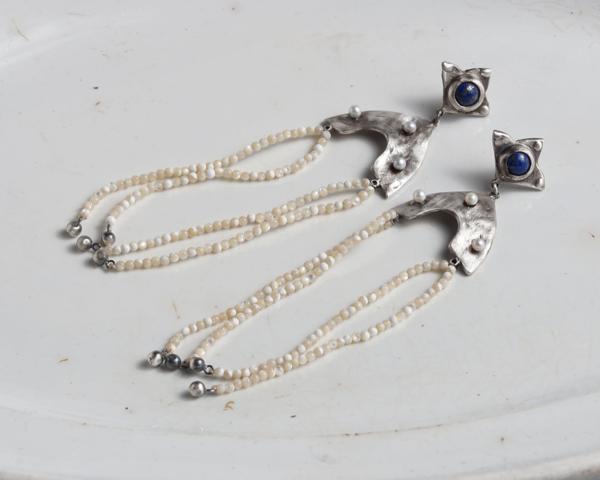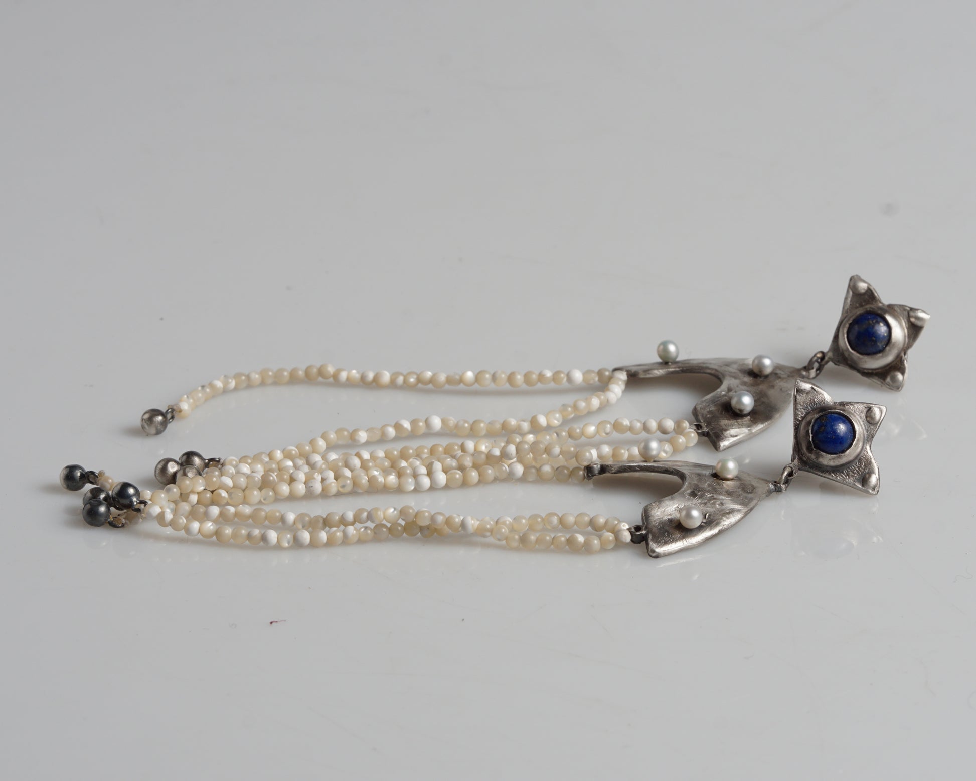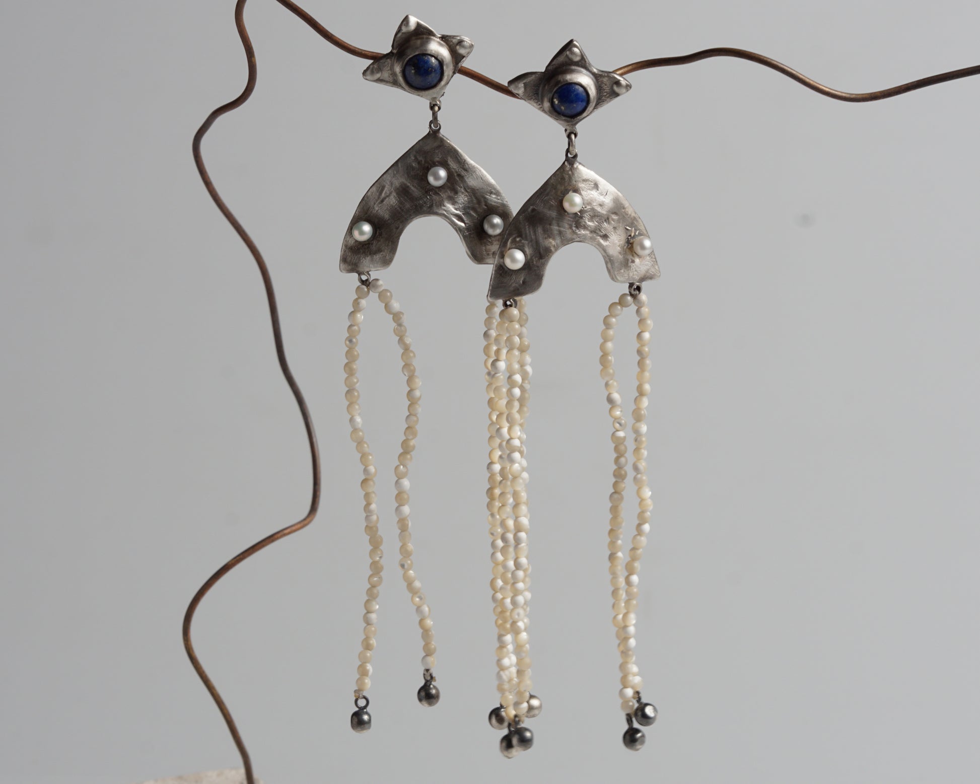 The Marfa earrings are handcrafted from fine silver and decorated with small mother-of-pearl beads. The kokoshnik-shaped element features three small pearls, and the upper part is accented with round lapis lazuli stones. The closure is comfortable and secure.