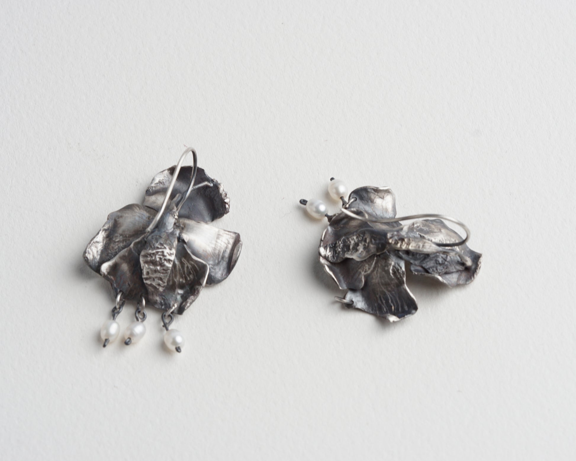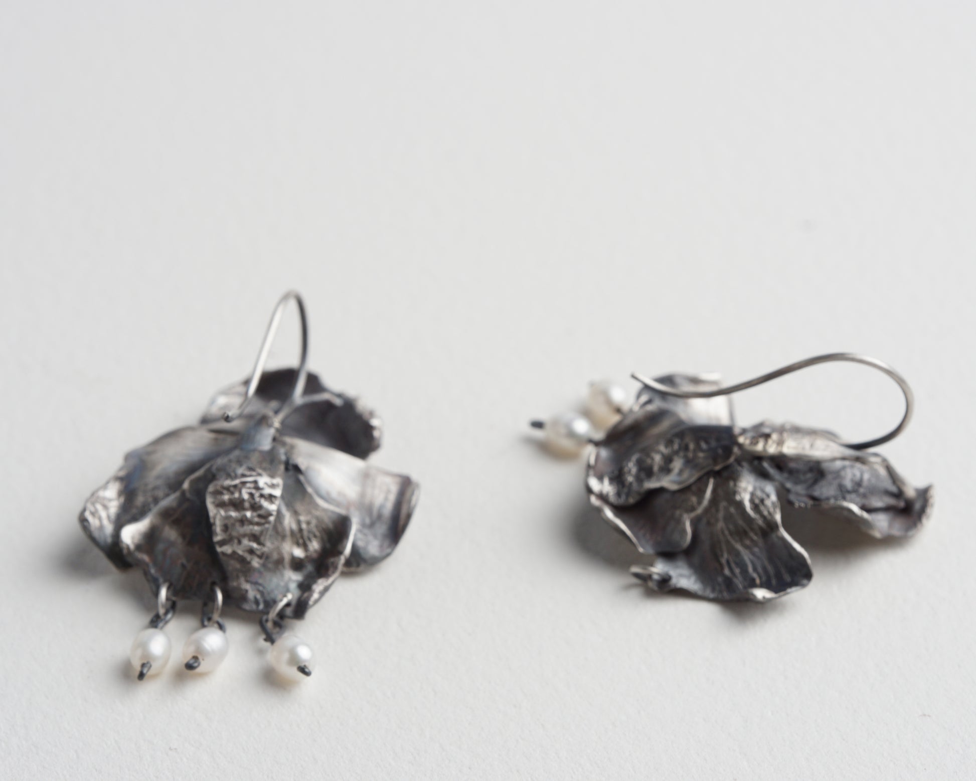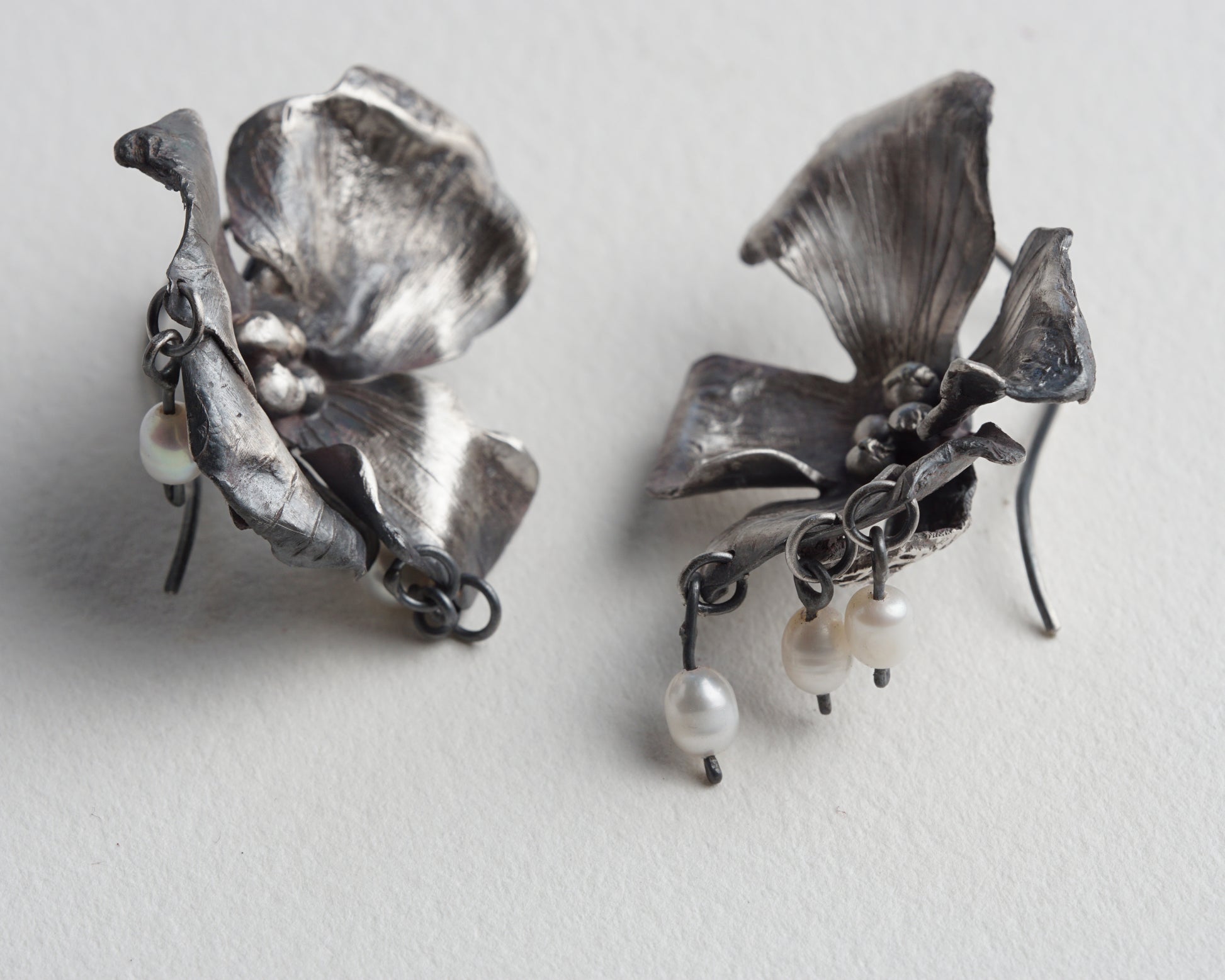 Orchideen-Ohrringe mit kleinen Perlenanhängern. Aus Sterlingsilber handgefertigt.Bequem und einzigartig, geeignet für den täglichen Gebrauch und besondere Anlässe.Einzigartiges Stück.