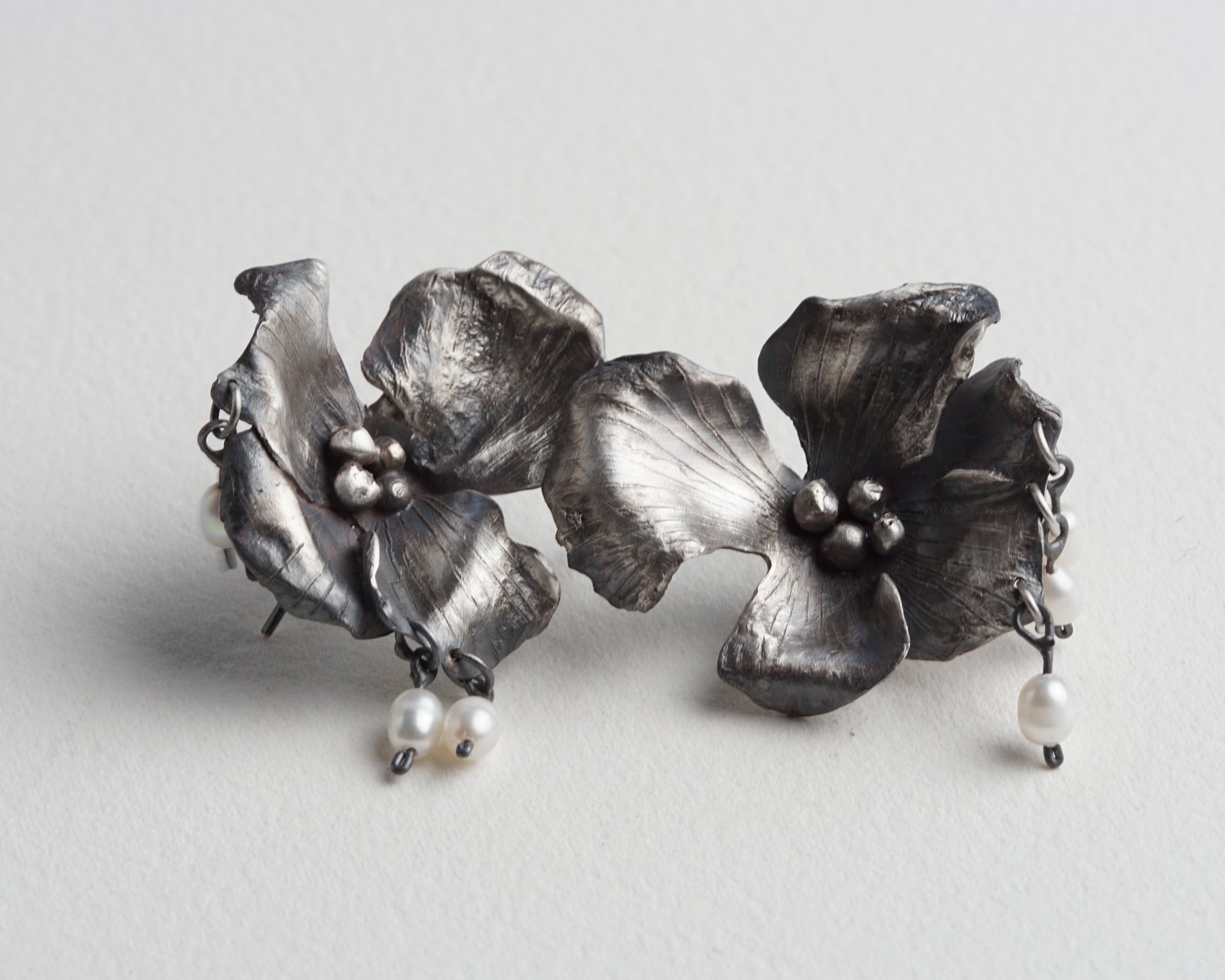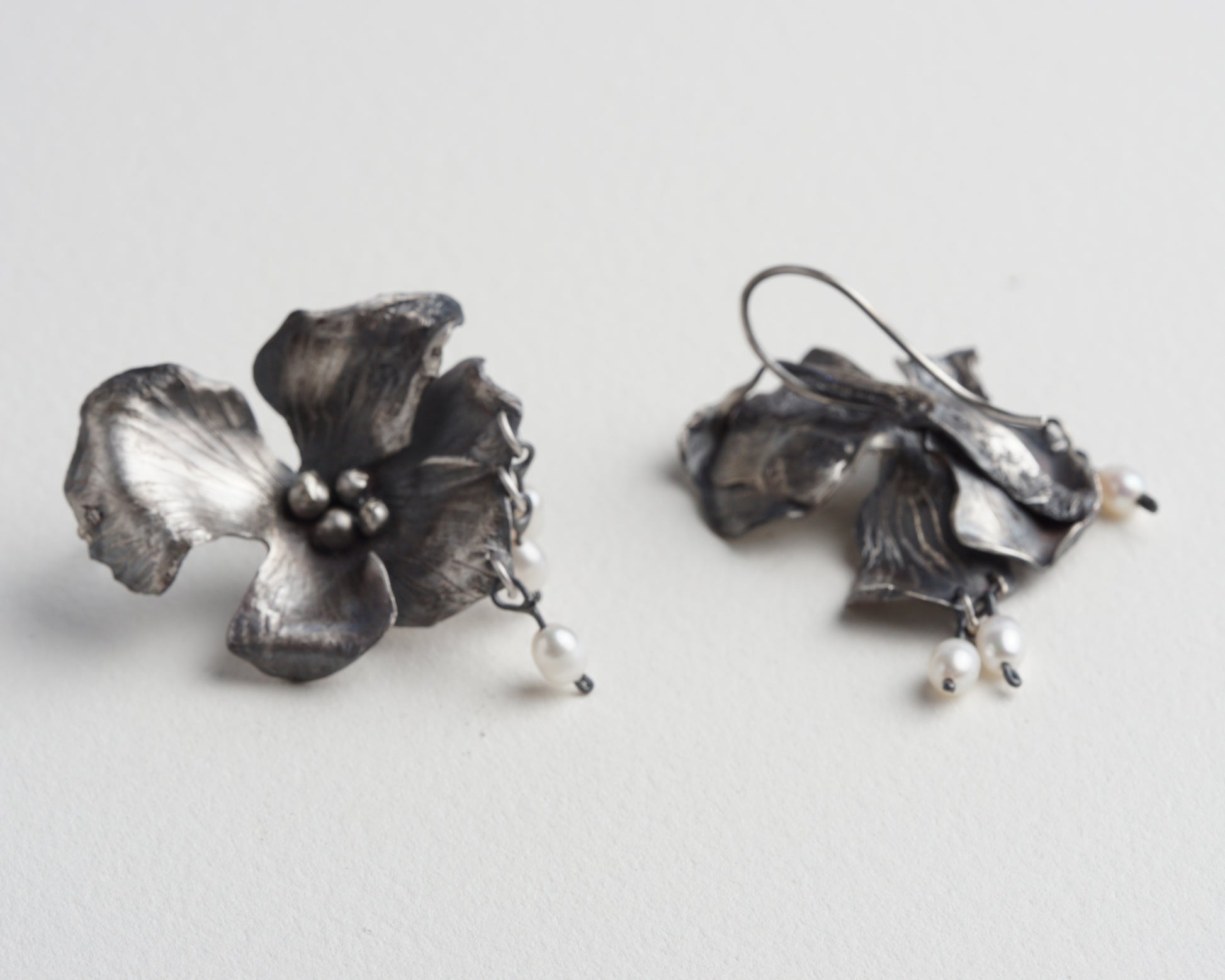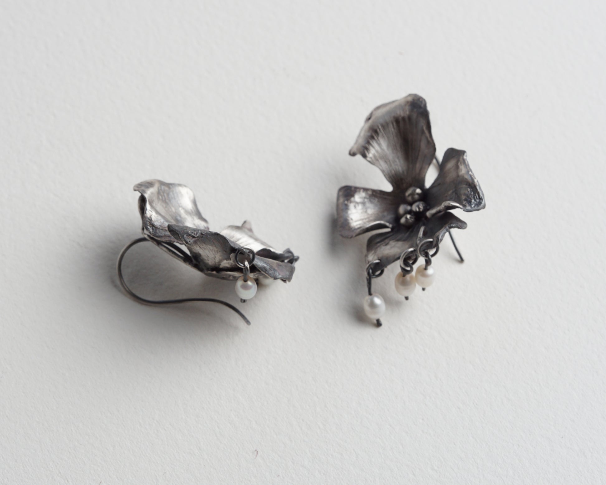 Orchideen-Ohrringe mit kleinen Perlenanhängern. Aus Sterlingsilber handgefertigt.Bequem und einzigartig, geeignet für den täglichen Gebrauch und besondere Anlässe.Einzigartiges Stück.