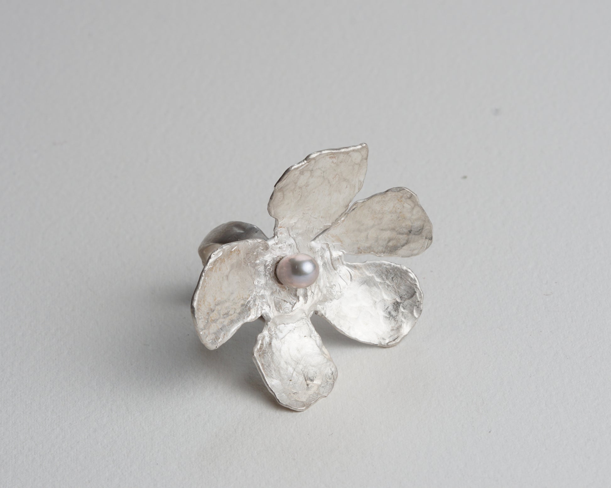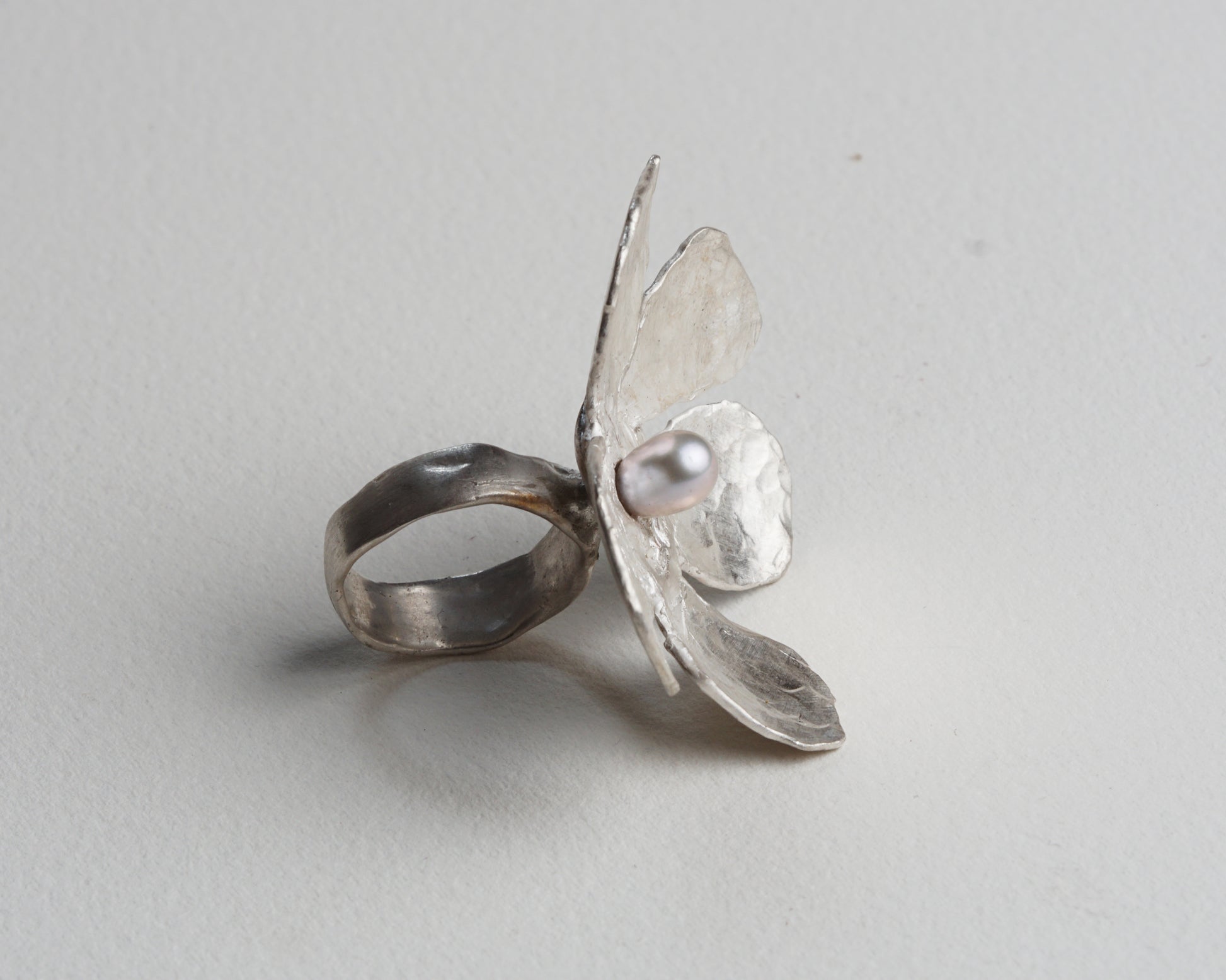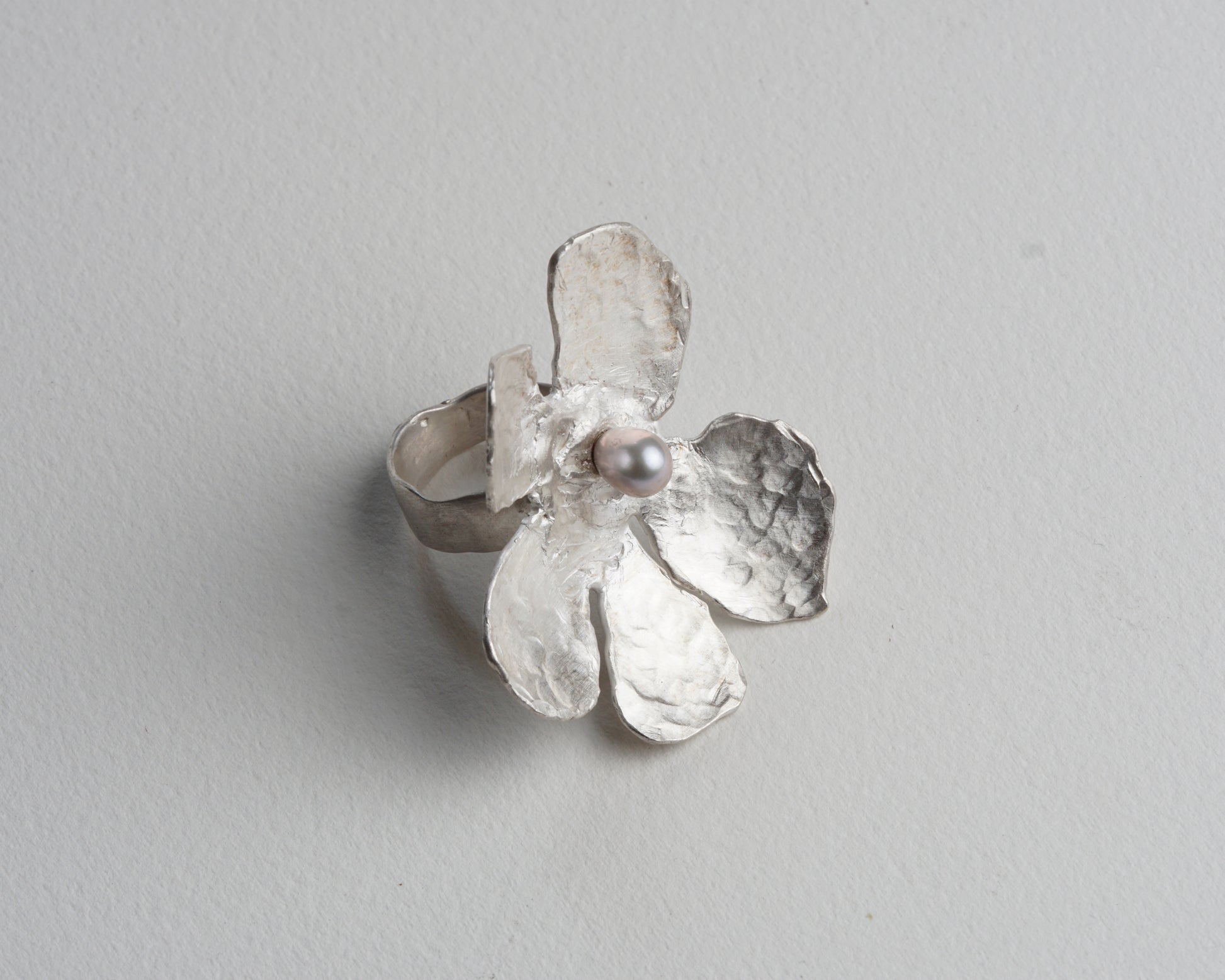 This statement ring showcases a bold flower motif in hammered silver, centered with a grey pearl. It complements a minimalist style effortlessly.