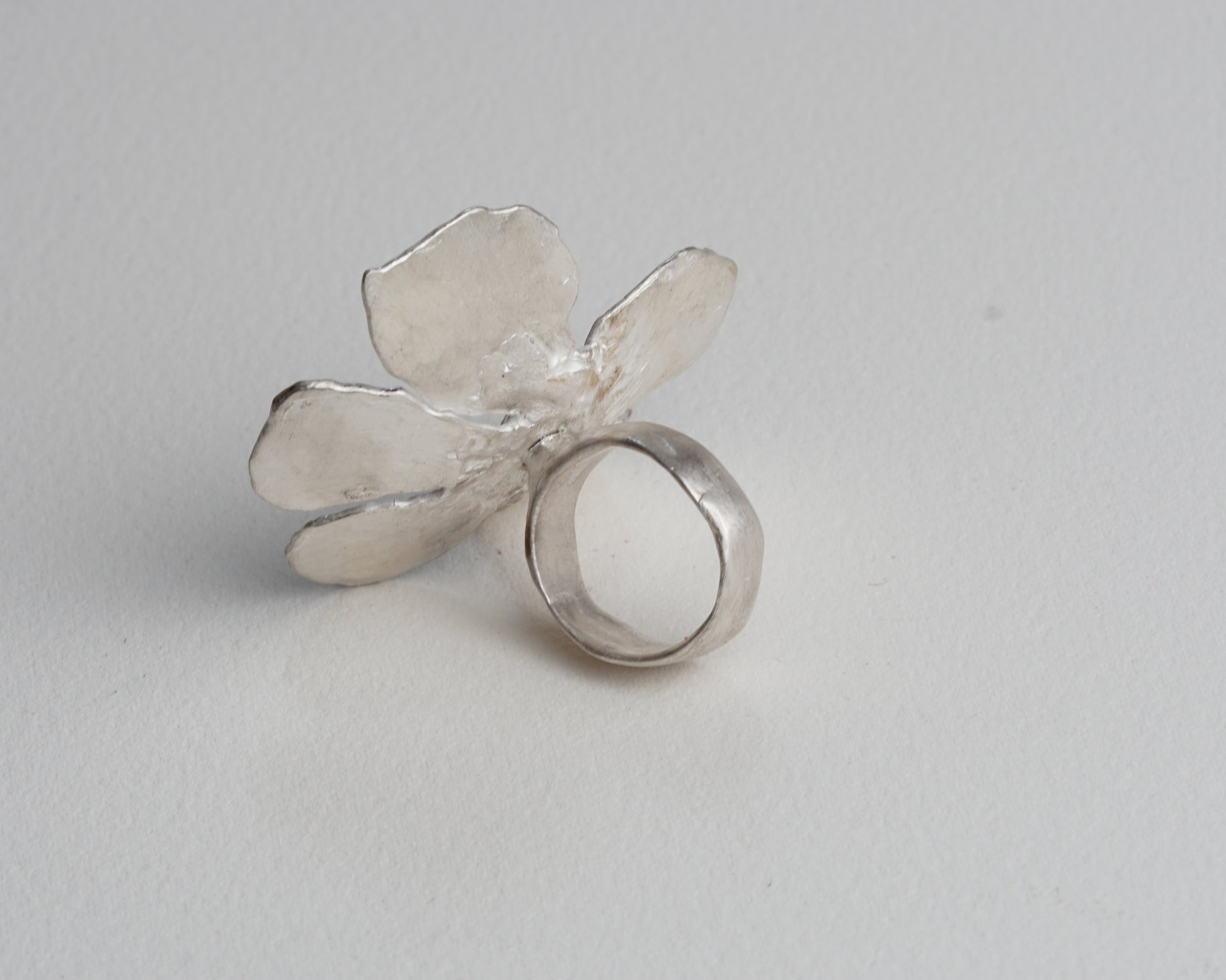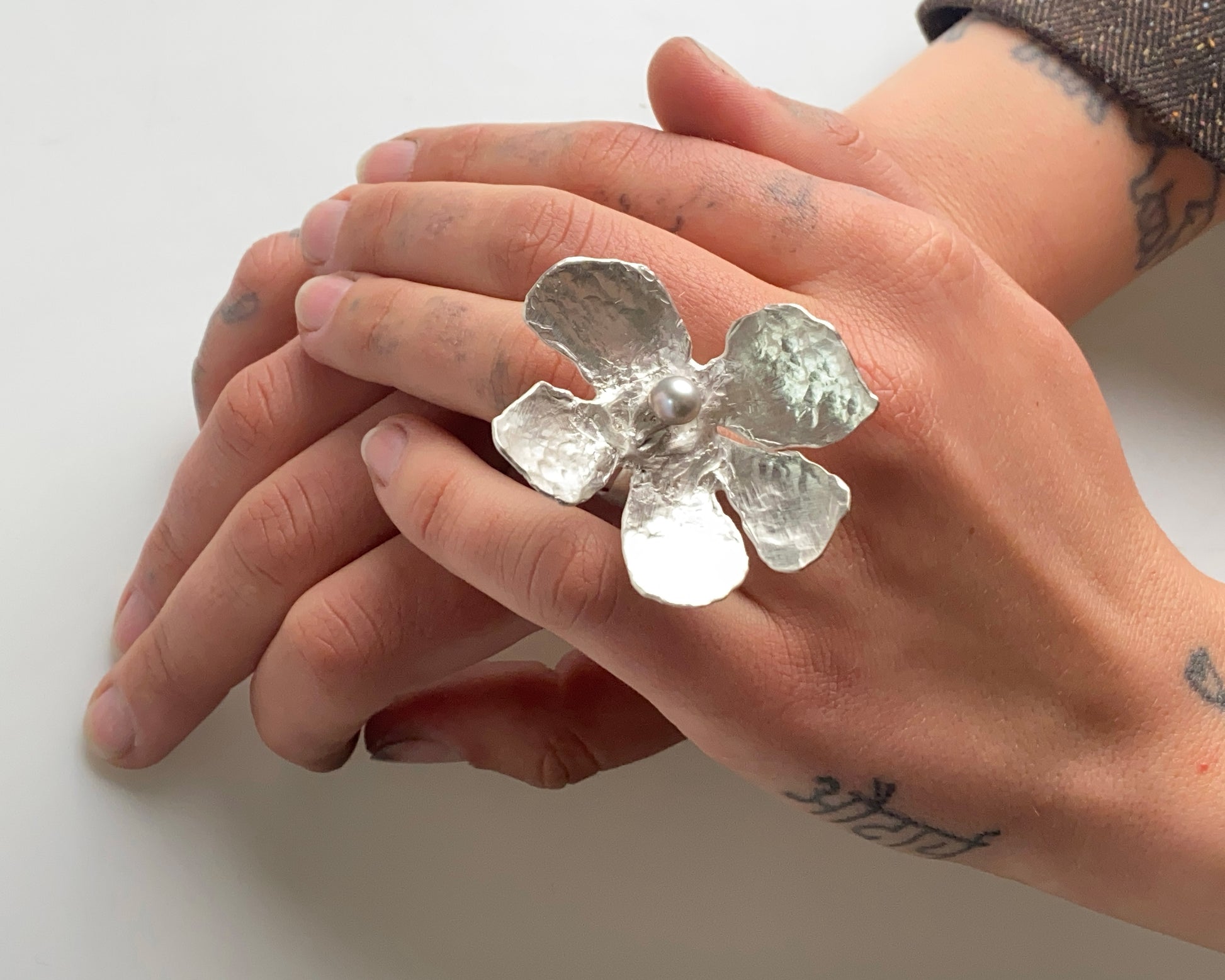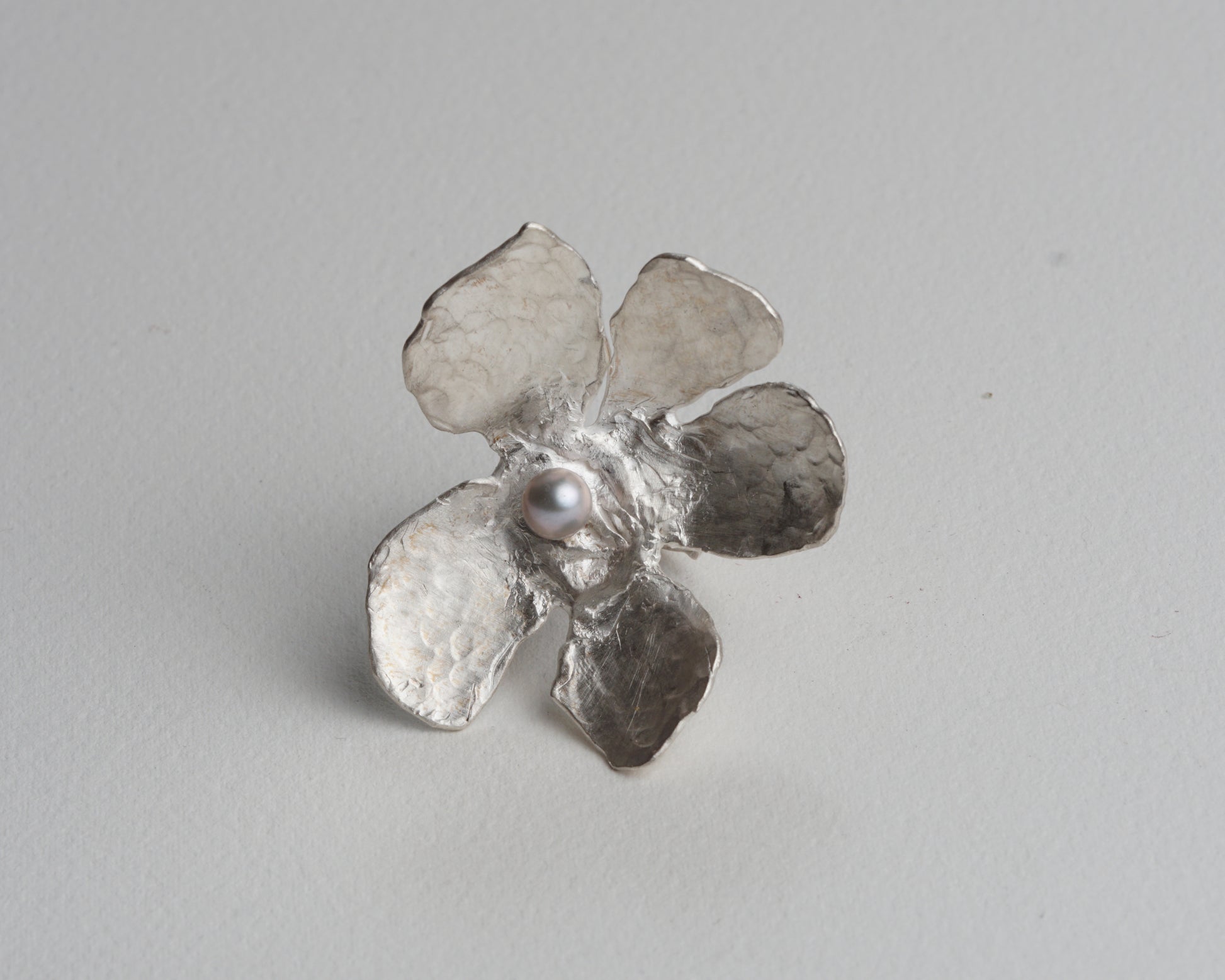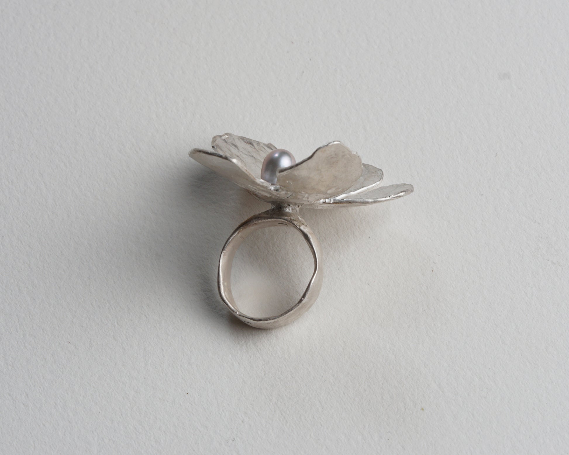This statement ring showcases a bold flower motif in hammered silver, centered with a grey pearl. It complements a minimalist style effortlessly.
