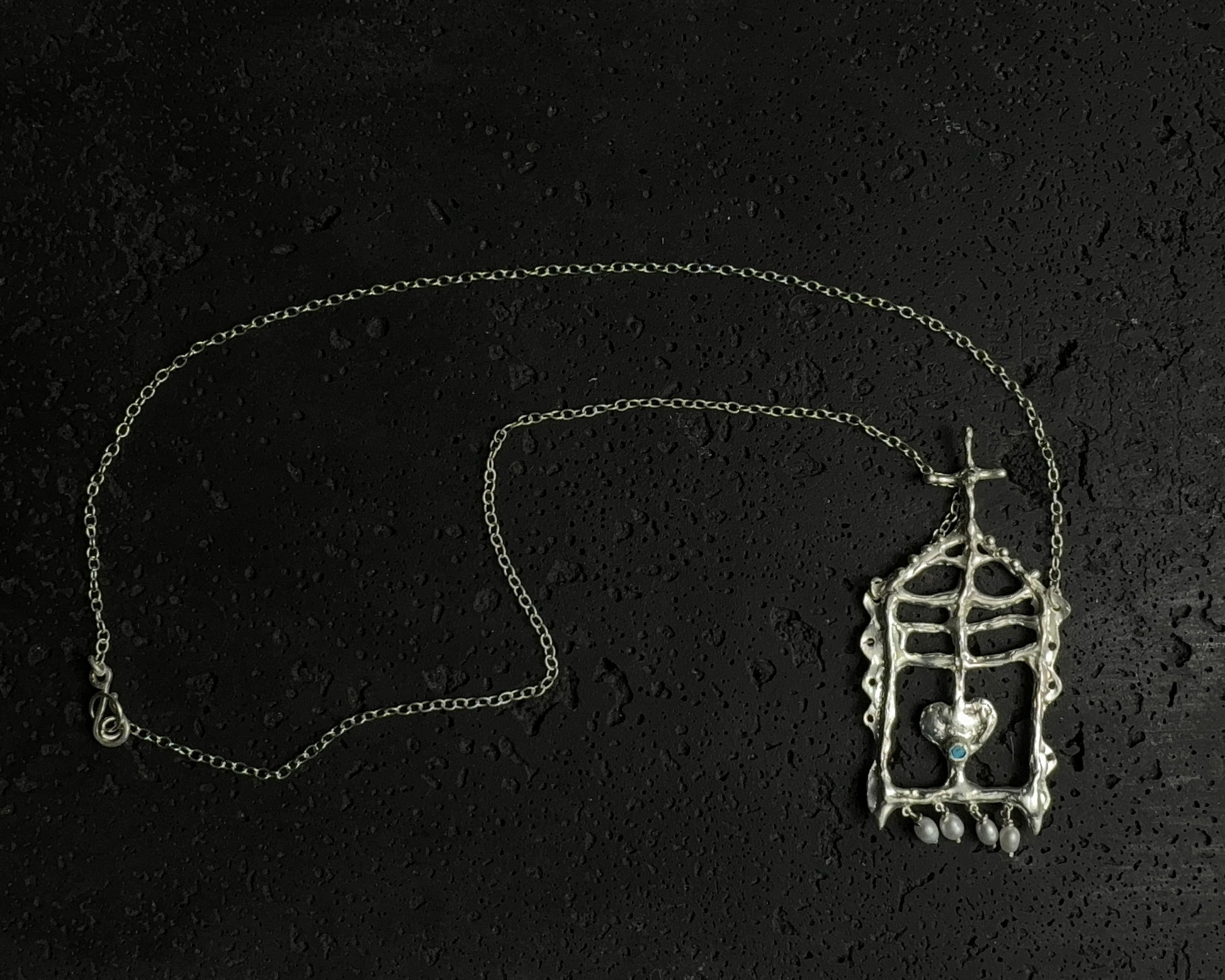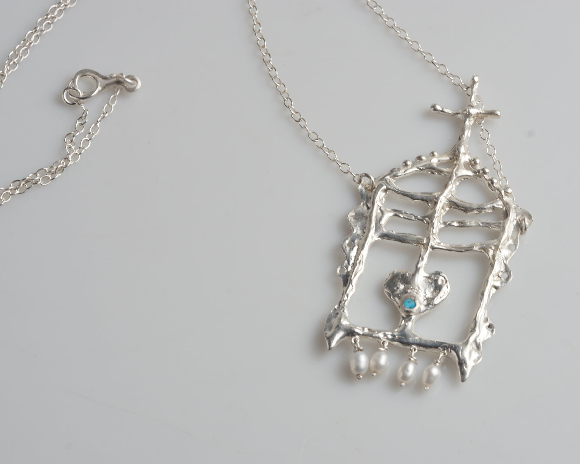 Handcrafted silver necklace featuring an openwork pendant shaped as an architectural frame with a cross at the top. The pendant is adorned with a small round sky-blue turquoise stone set in a heart-shaped bezel at the center, with three freshwater pearls suspended below. This one-of-a-kind piece