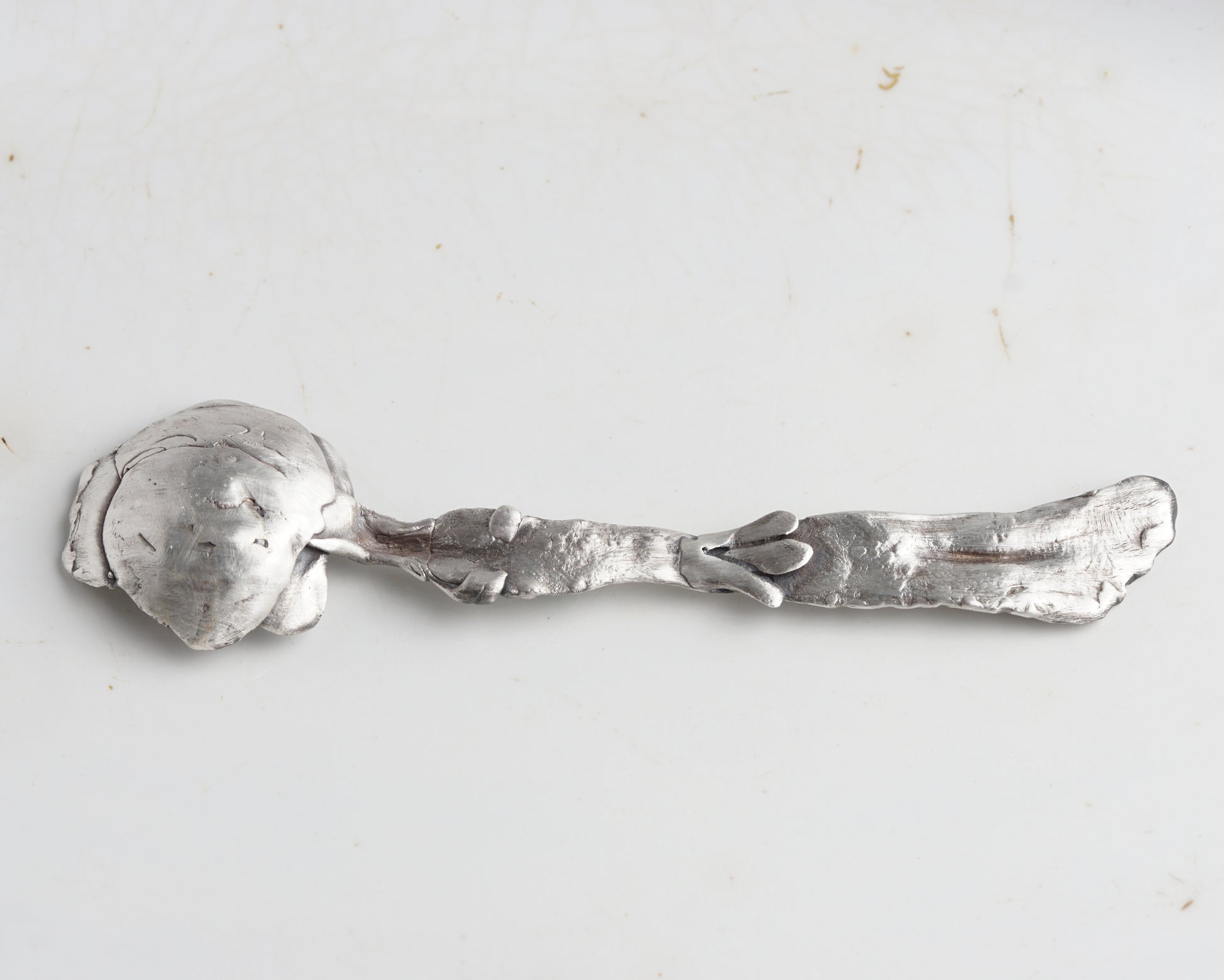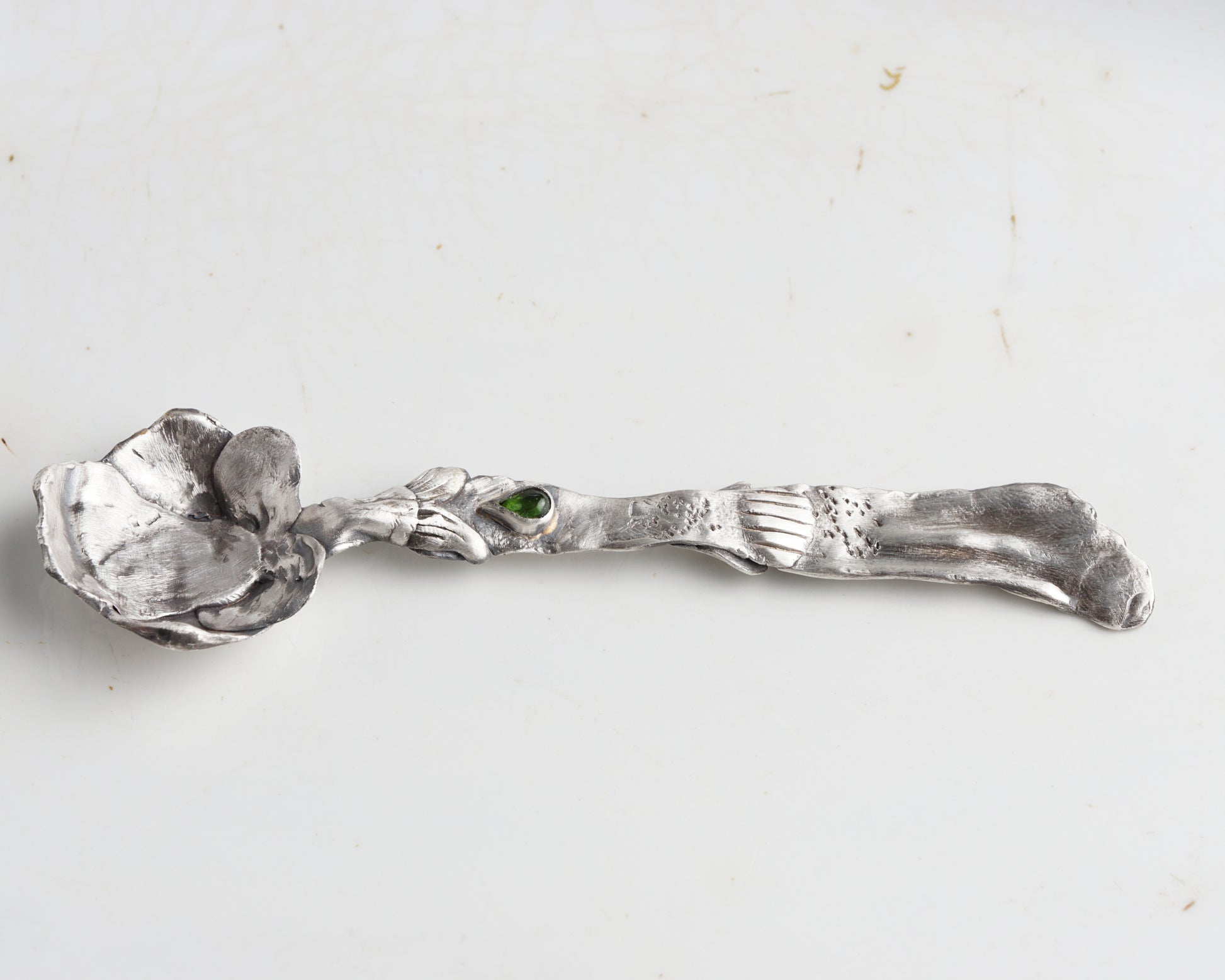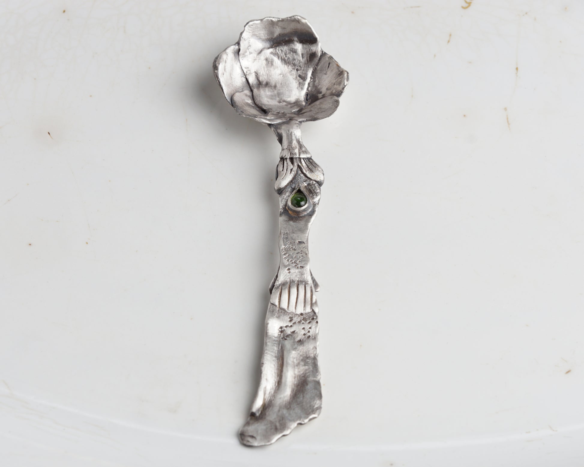 A handcrafted silver spoon of an imaginative shape inspired by plant forms with a green tourmaline. There is an old tradition of gifting a silver spoon to a newborn for their birth or Christening.