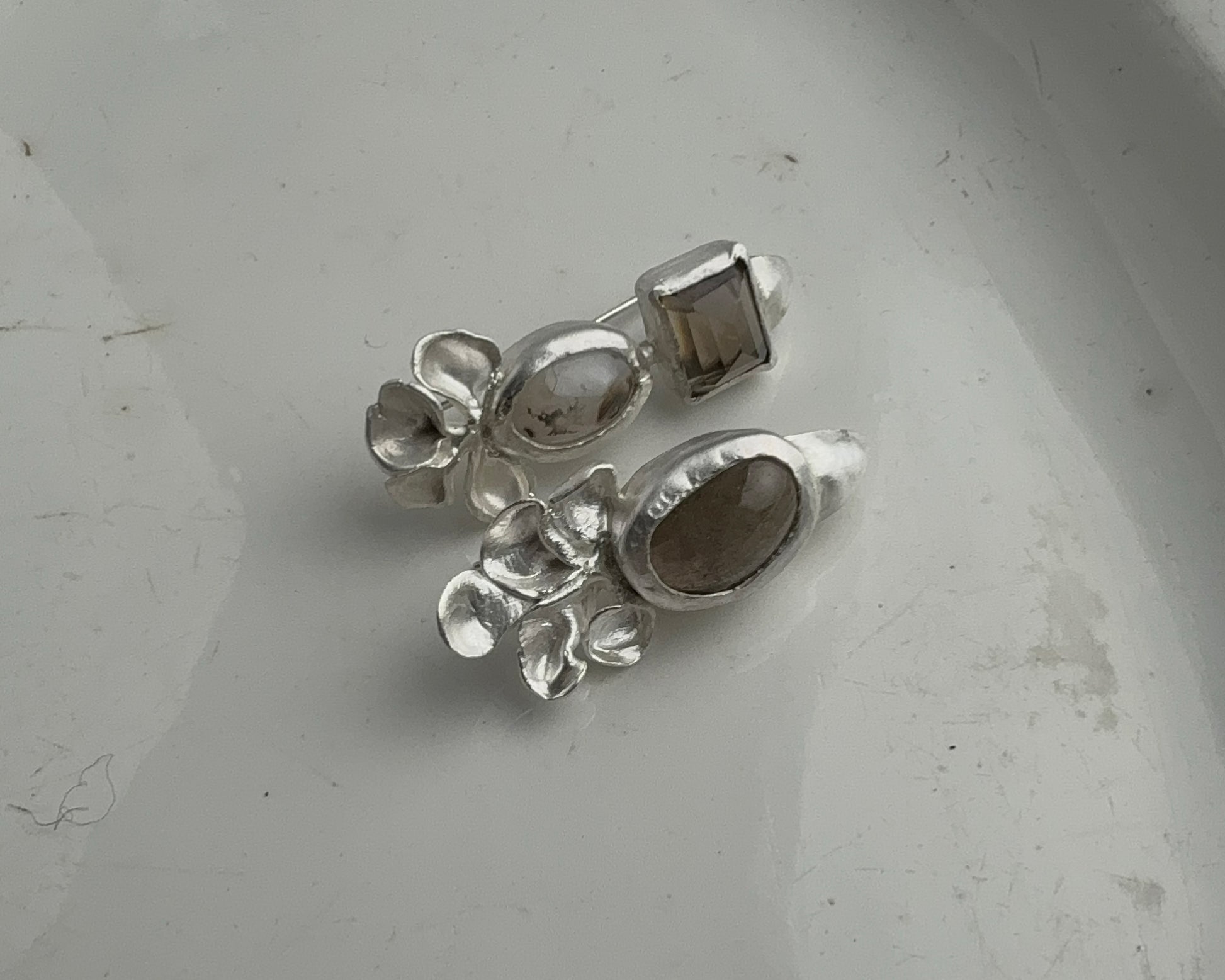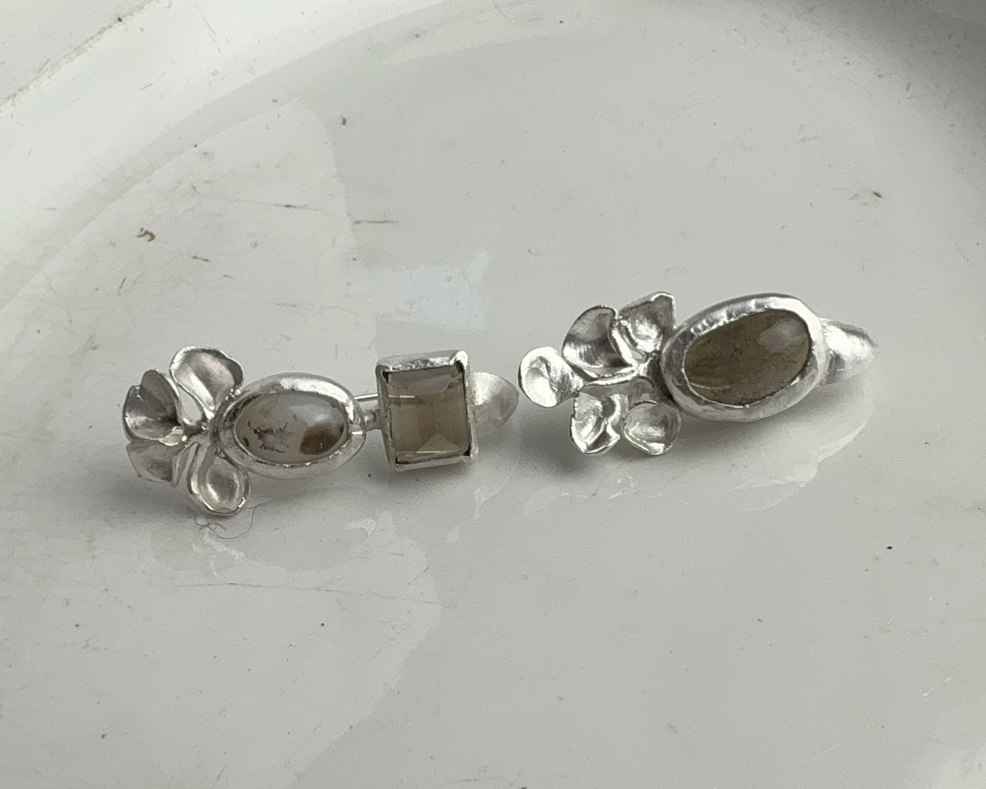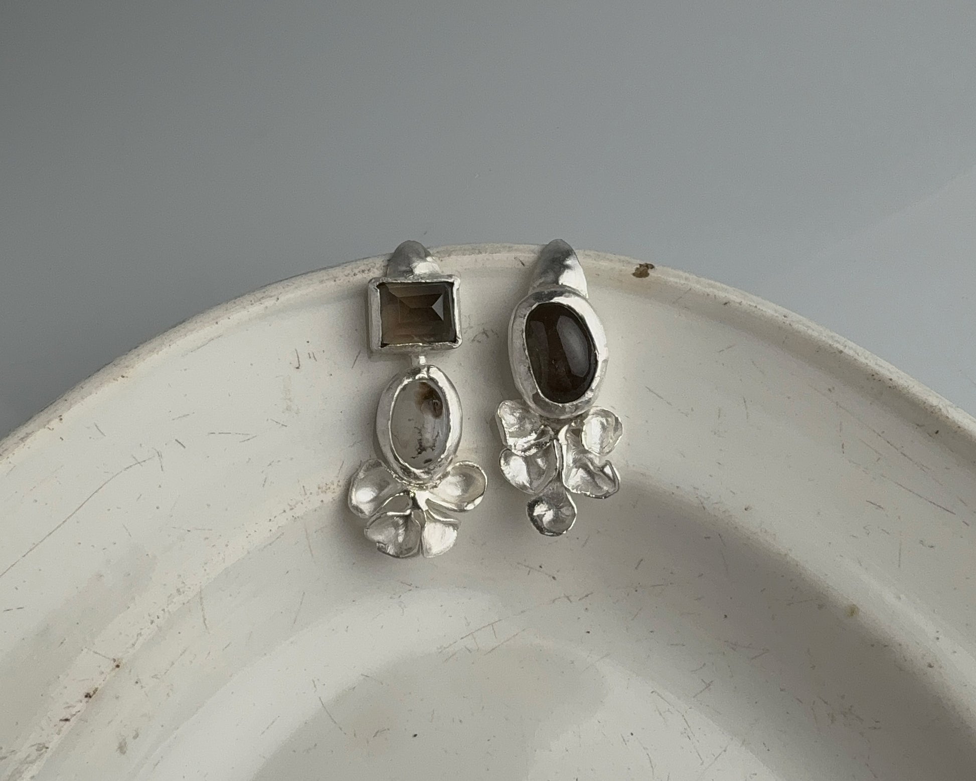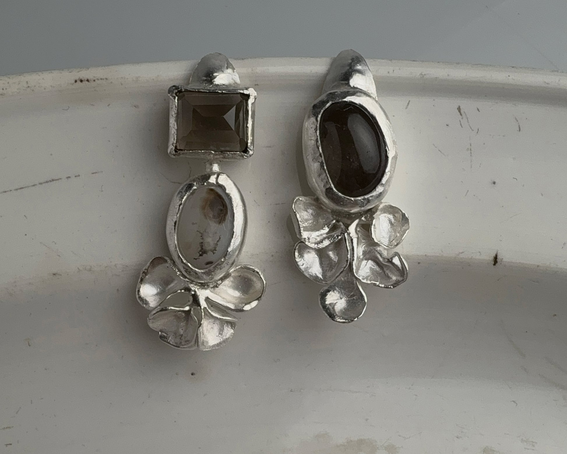 Handcrafted silver earrings featuring two smoky quartz stones—one smooth, one faceted—paired with white agate showing smoky inclusions. Each piece is hand-sculpted with minimal finishing, preserving the marks of the making process. In a single copy.