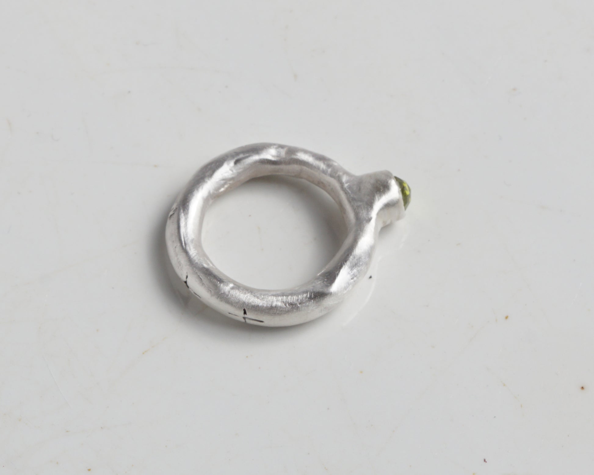 A solid silver ring set with peridot, featuring three star marks on the back side. The ring has a refined matte finish that emphasizes the natural form of the metal and the soft green tone of the stone.